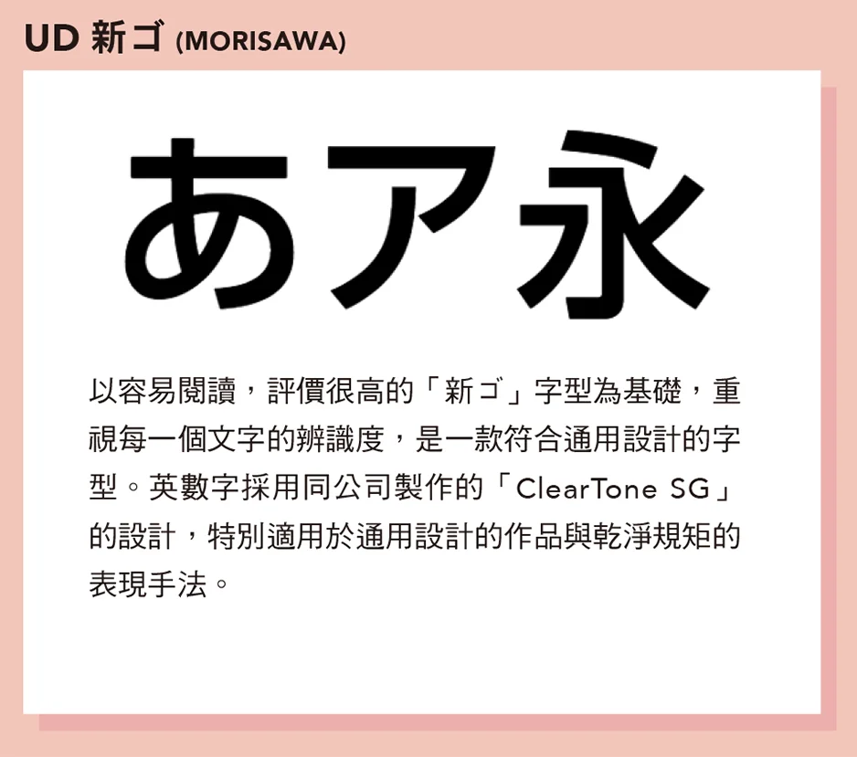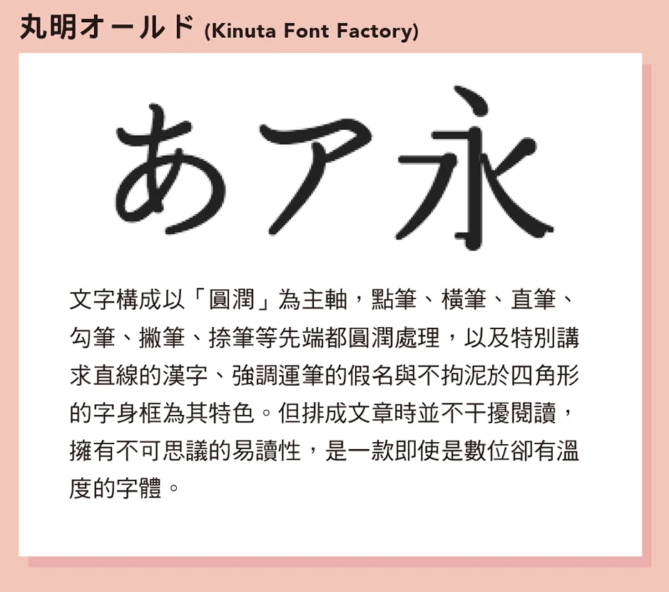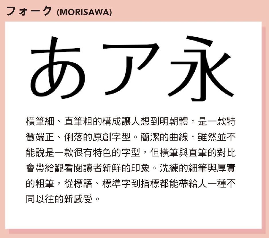 字體的流行跟時代脈動息息相關。回顧日本印刷常見的幾種字體,在數位剛興起的年代,帶有裝飾性、浪漫的仿古字體相當流行,隨著大家對辨識系統的關切,帶有現代感的通用設計字體成為後來的顯學。而後流行的字體,不再是one for all,它們與通用字型相反,風格更強烈。