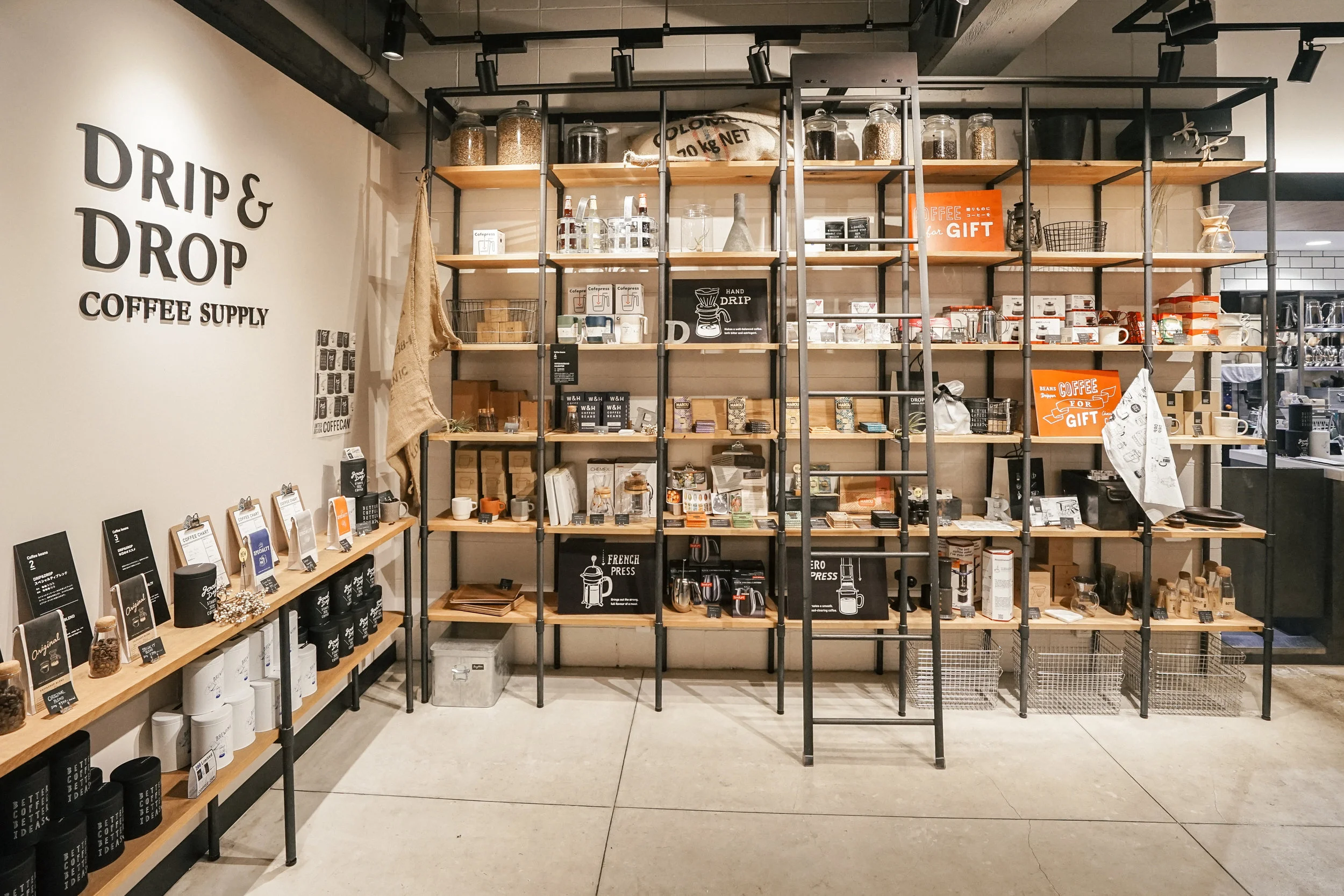 整櫃的咖啡豆與咖啡器具,正好讓人將喜愛咖啡的香氣實踐到生活之中。在這不只是喝咖啡,還能將咖啡帶回家中,延續Drip & Drop Coffee Supply的記憶。