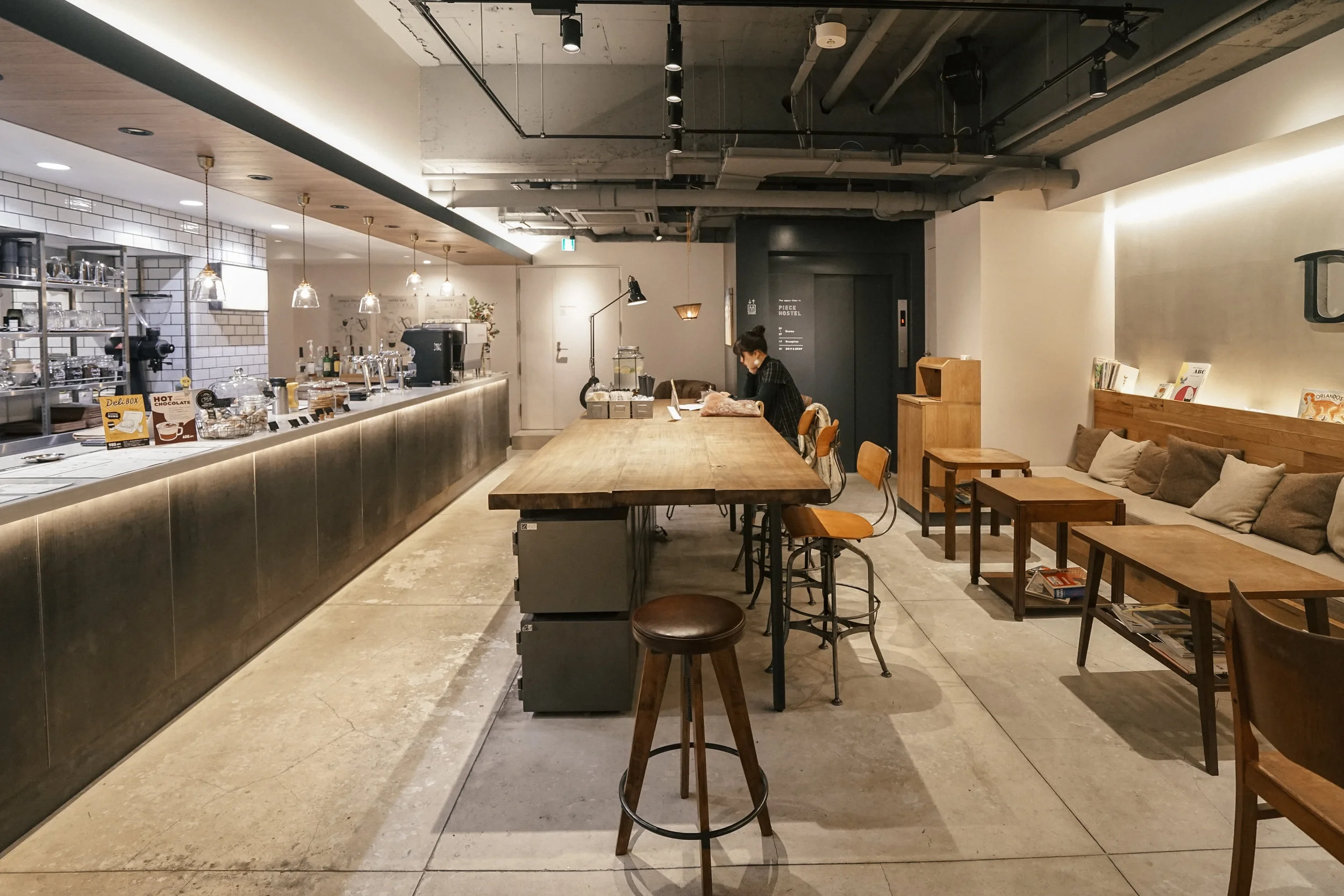 雖然我也是偶然發現,但只要來到京都,總是會來這喝上杯咖啡。附屬於旅館的咖啡館,與旅館一樣的乾淨俐落,暖色系的寬闊空間,像是個這一區的秘密基地般帶點溫暖。有著一排靠牆沙發區座位,中間的大桌成了整個焦點,我也很喜歡這種分享式的大桌,很容易的可以交到朋友閒聊一下,面對著開放式的廚房與長吧台,顯得更加乾淨俐落。