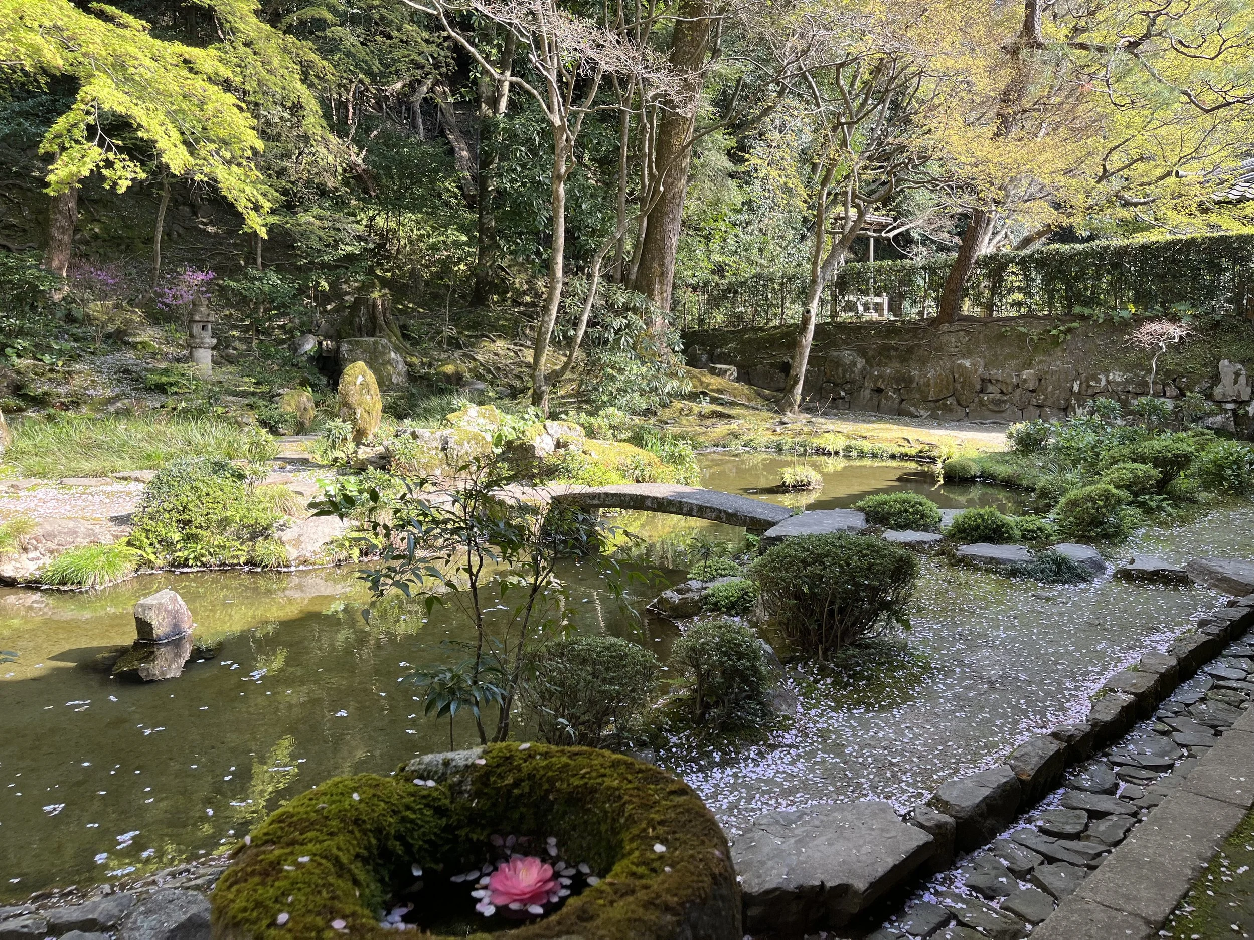 那場演奏會的場地在法然院的方丈禪室,平常放了京都畫家堂本印象畫的紙門,一般不對外公開,只有春秋兩季各七天的特別拜觀才有機會深入堂奧。方丈禪室面對的方丈庭園,有淨土宗意涵的石山與石橋配置。本堂在阿彌陀佛前日日供花,花朵散落木地板上,名為「散華」儀式,以二十五朵香花象徵往生之際來迎的二十五菩薩,美的不得了。時值椿花盛開時節,木地板上的椿花是救贖的象徵,是大往生境界。