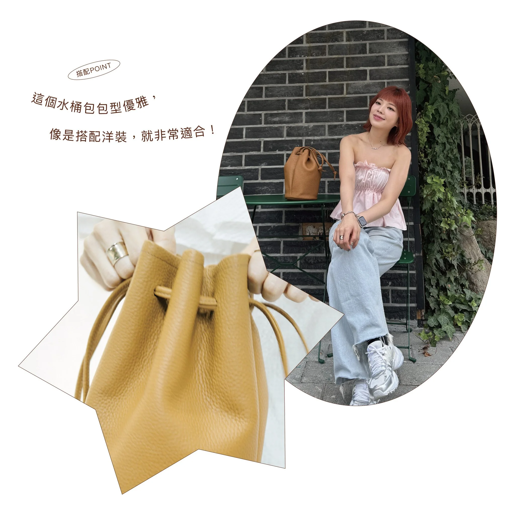 LEZALI由曾獲得日本皮革大獎獎項的猪瀬新吾監製。這款水桶包將日本傳統的束口袋以現代風格轉譯,包口的摺法增添包包線條的層次感,卻簡潔不複雜,搭配細皮革背帶,將造型收斂在典雅的日式設計風範中。更以特殊的技法為皮革壓製紋路,使其硬挺,加上圓形的底座設計,即使沒有內容物,包包也能維持得十分立體、能獨自站立。
