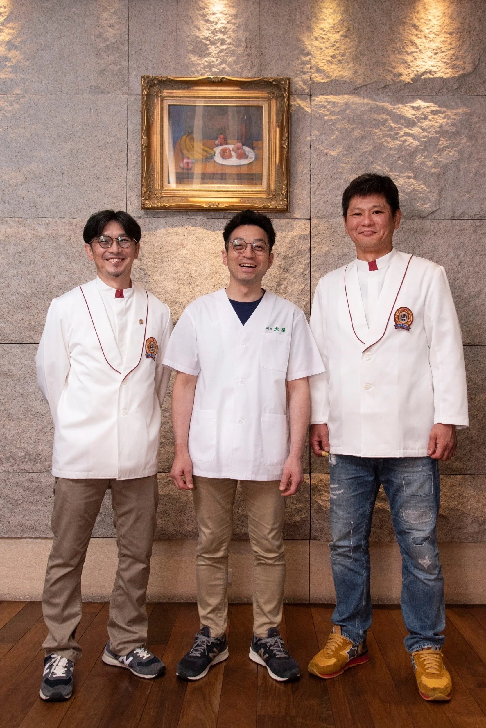 三位和菓子職人:関市虎屋三代目-古田敦資(中),與日本全國和菓子協會認定優秀和菓子職人-窪田和仁(左)、高木康成(右)。