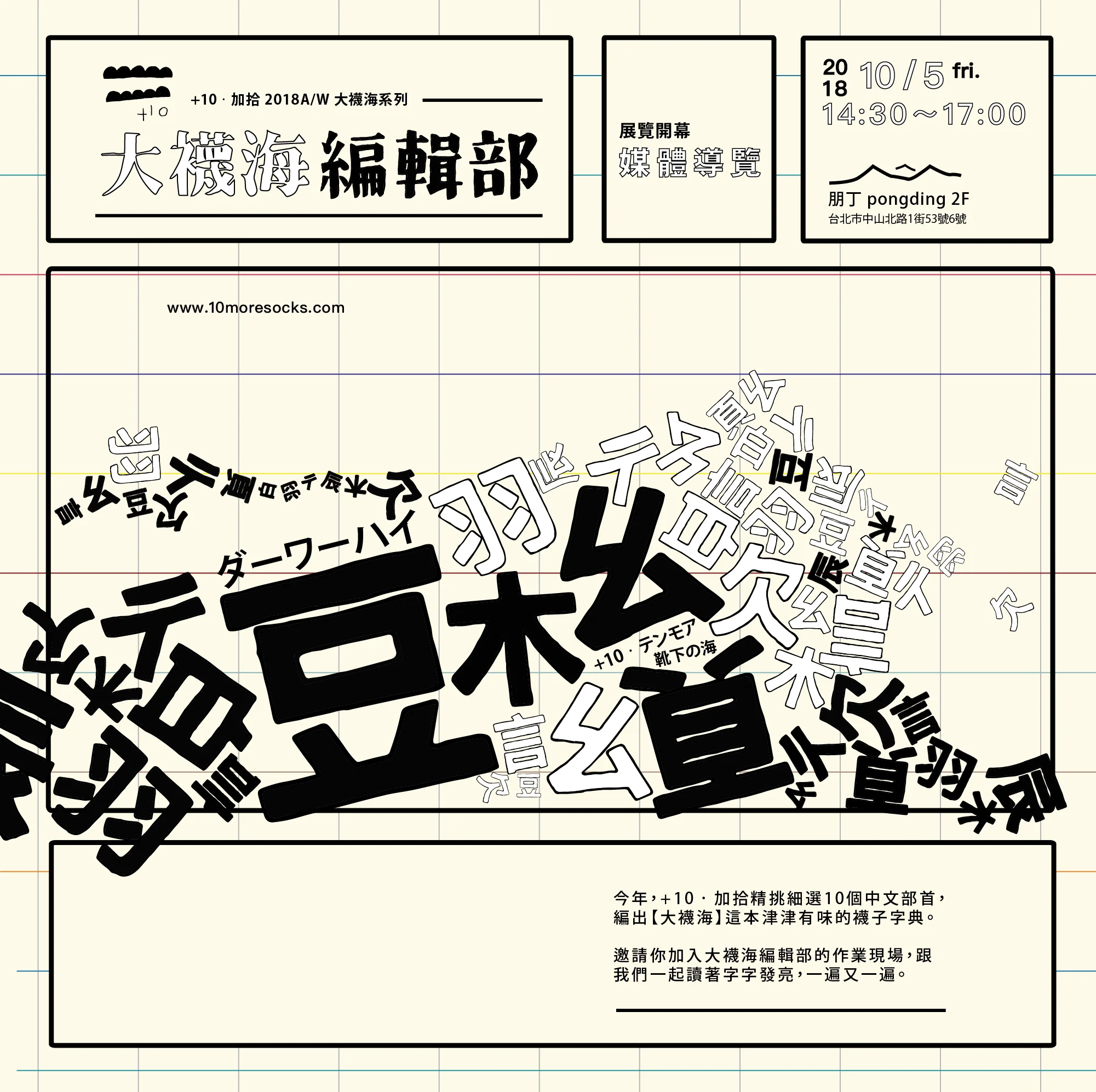 總是透過設計對日常的美好想像,並將優良品質帶進生活用品當中,最天馬行空的臺灣襪子品牌+10・加拾,今年秋冬將設計靈感延伸到眼前所及的所有文字,拆解字元間的部首,將具象文字抽象化,挑戰用部首發揮設計創意,如同辭典編輯,把部首的形狀,組合的字意、被延展的有趣,在朋丁開立限定編輯部,同步推出2018秋冬「大襪海」系列,讓眼裡看的、嘴裡閱讀的文字,全都編進襪子裡!