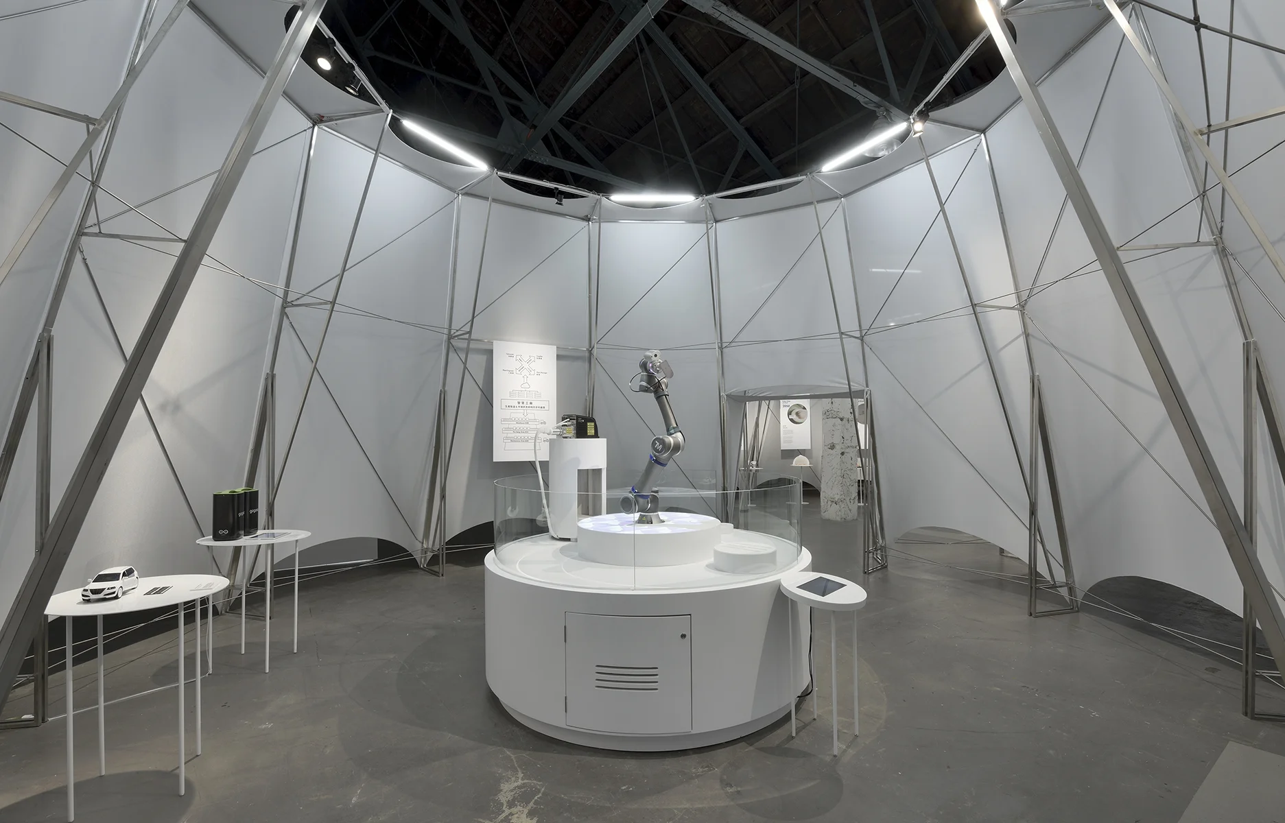 以時間為軸心,穿梭在一個個圓形展區中,就像是進行現在與未來的交流,自由遊走在其中的參觀者,象徵著人在時間中的必要性。Panasonic認為,時間是相對值,因為人,這個相對值不再只是單純的物理定律,而是思索各種議題的軸線,定錨我們所關注的議題,提供人們更踏實的想像。