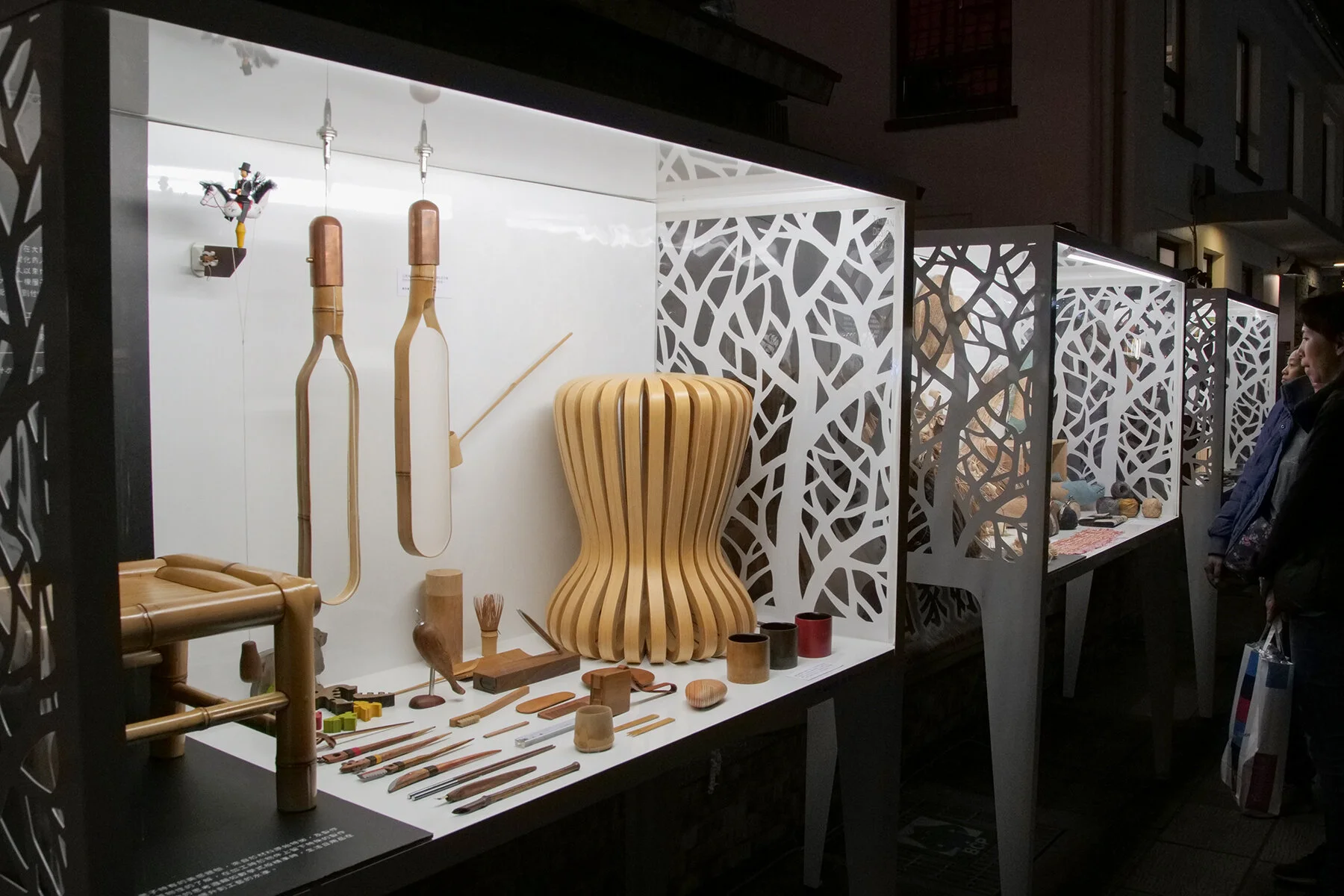 一走進藍晒圖文創園區,就能看見兩旁的設計櫥窗。在11個櫥窗裡頭,策展人王士俊藉由傳統的物品對比現代的設計產物,讓觀眾能夠輕易地看見設計所帶來的轉變。像是在鐵材的部分,可以看見日常可見的不鏽鋼水壺,與Alessi水壺的並置,讓人一眼就感受到,原來同樣的材料,透過不同設計思維,竟可以創造出完全不一樣的感受。