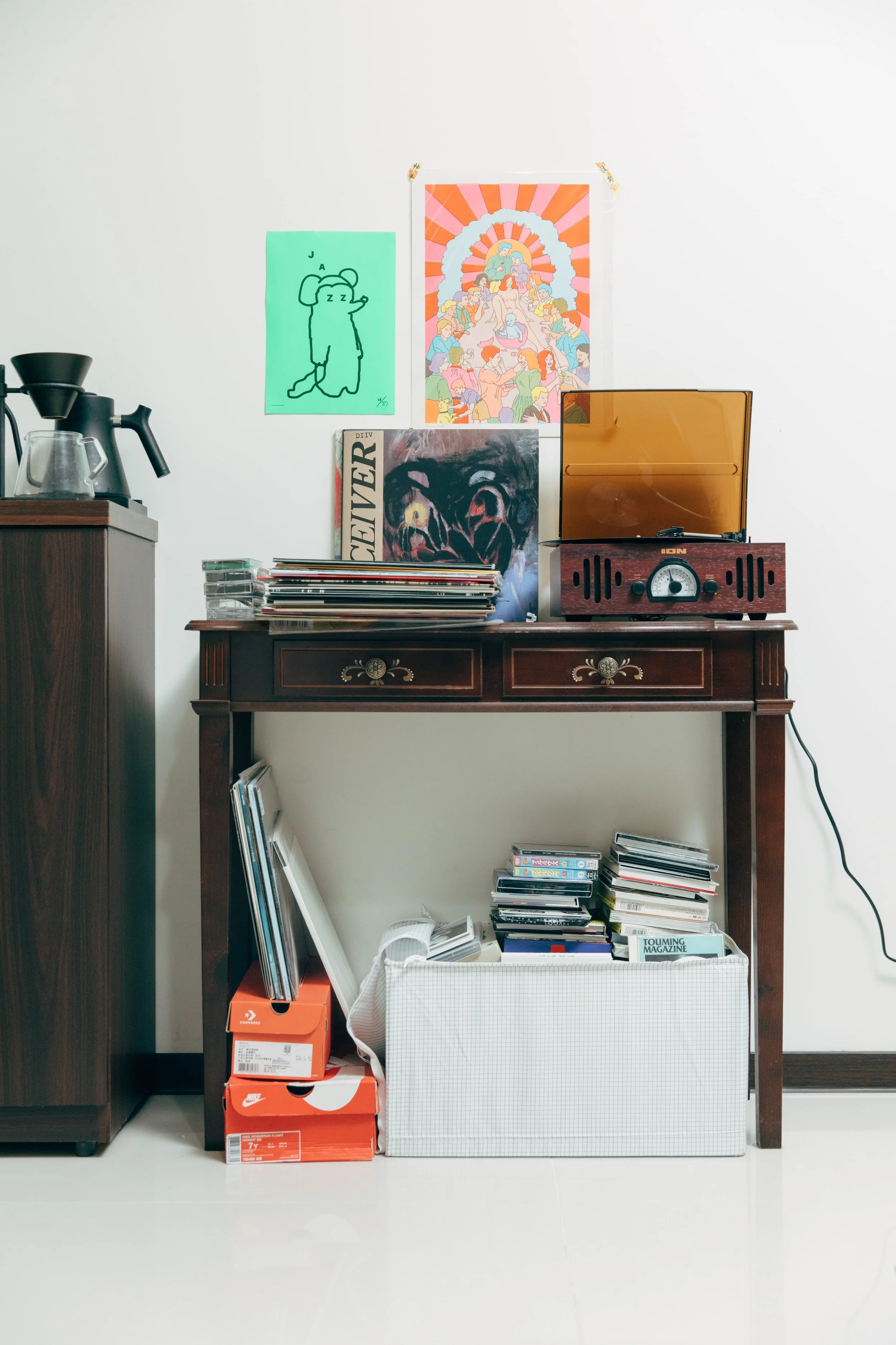 從玄關一進來,喜愛的黑膠及唱片散落在桌面,或被收進簡陋的箱子裡。