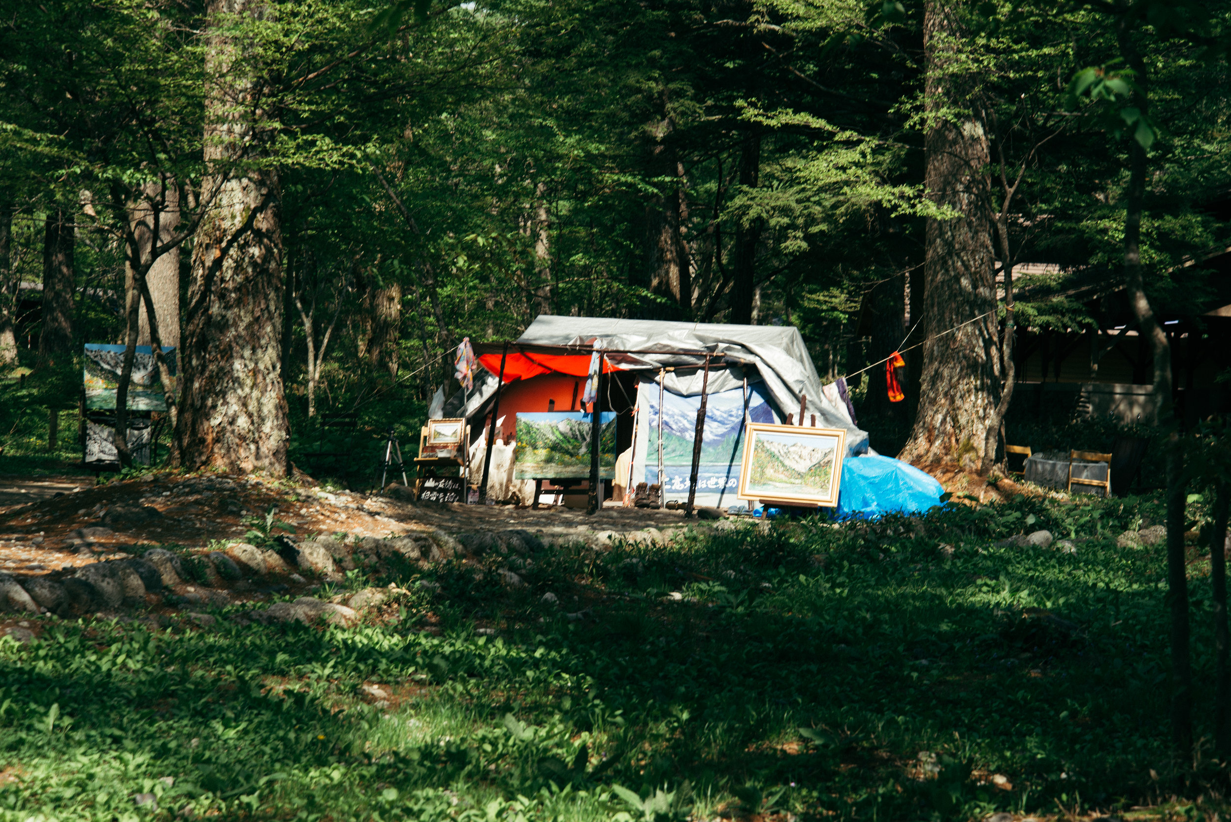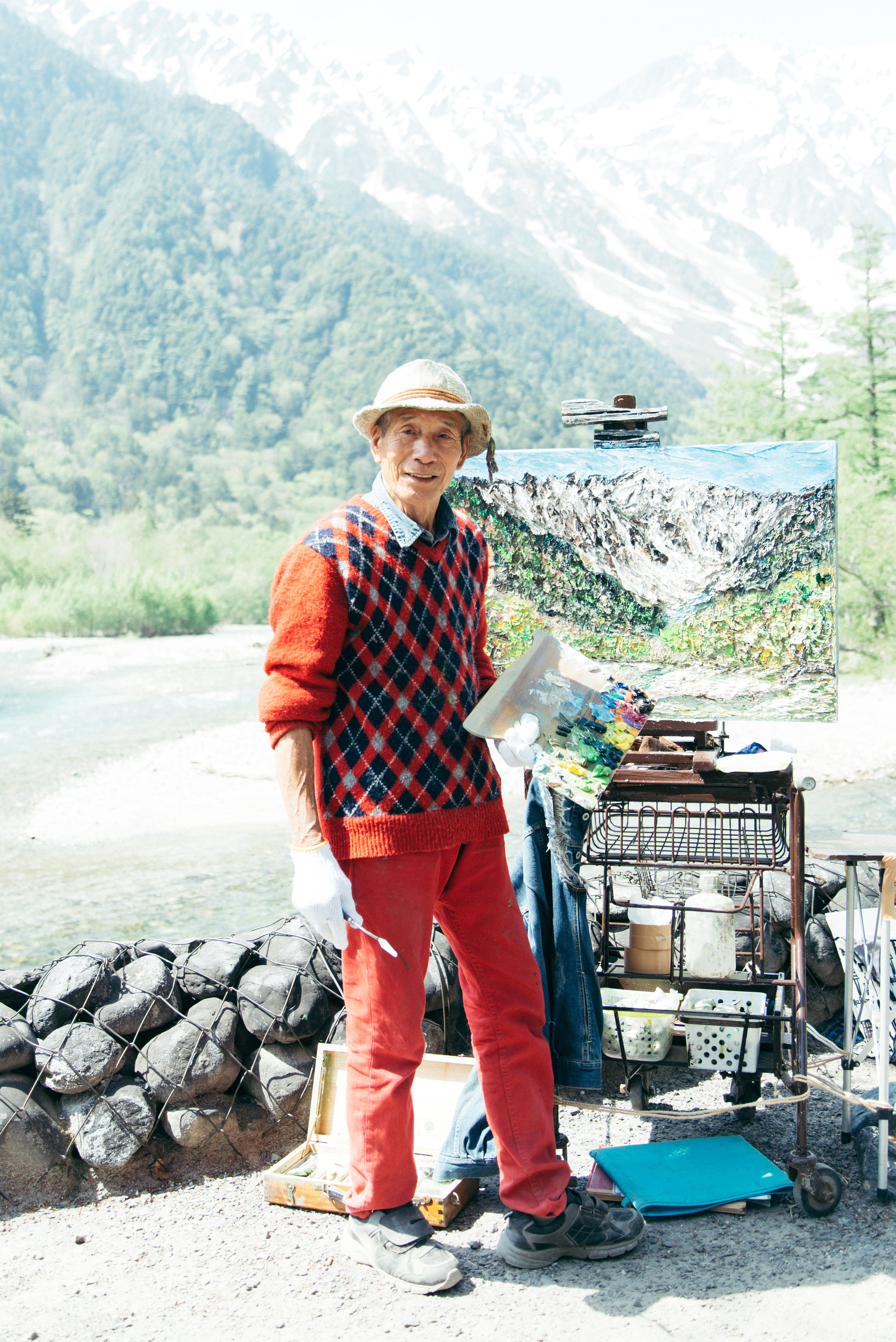 河童橋邊,穿著整身豔紅的爺爺正揮灑著顏料,連成一片山水。今年已78歲的渡邊勝夫,每年耗時半年紮營在上高地,專心致志地繪製眼前所見的上高地,至今已持續了58年。渡邊勝夫的「家」門外展示著自己的畫作,偶爾遇見山友好奇的詢問,就邀請對方到自己佈置的小木桌空間,暢聊一下午。「在山裡遇見的人,都是朋友。」著迷於上高地絕美景色的渡邊勝夫,彷彿是最浪漫的藝術家,年年都要與這片山林相遇才行,直到成為象徵上高地的一抹紅。