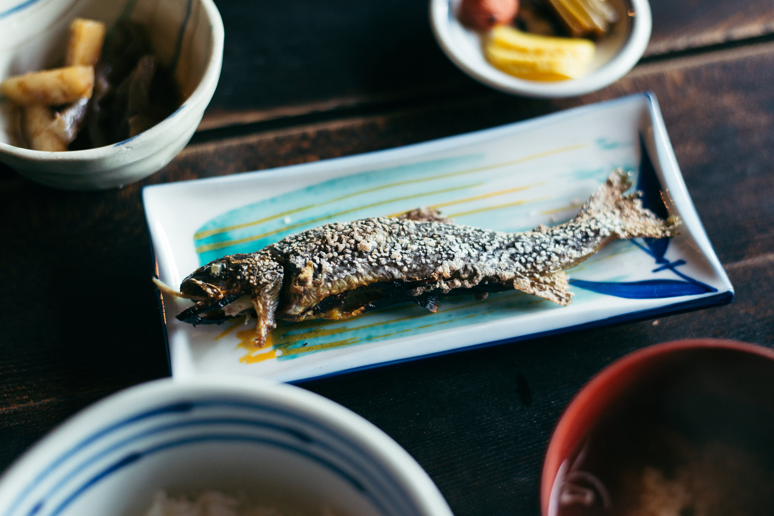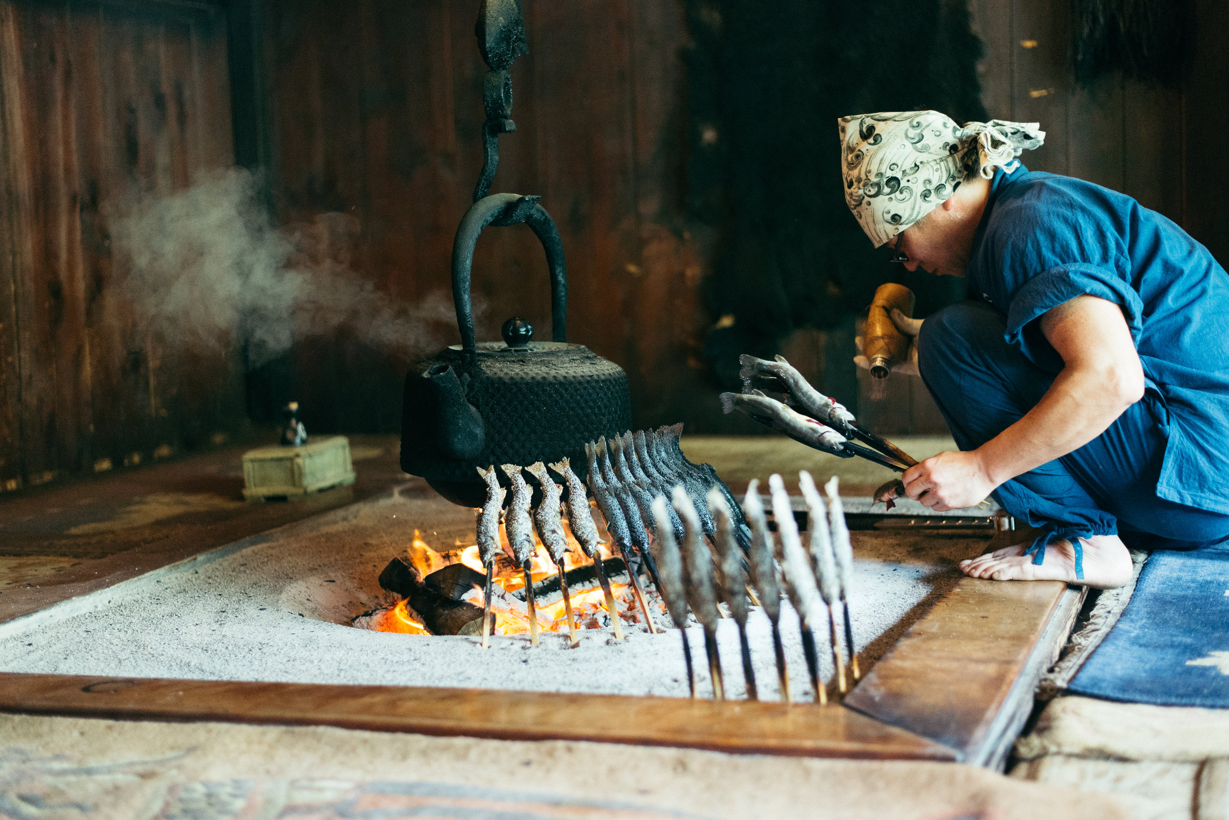 位在神社入口處的嘉門次小屋,則是日本登山之父Walter Weston的登山導遊上條嘉門次在1880年創立,如今由第四代店主、嘉門次的曾孫傳承這座百年歷史的山中小屋。小屋內的圍爐裏(註:傳統日式地爐)柴薪正劈啪作響,在屋子前的清流中捕撈岩魚,以竹籤串起、撒上鹽粒,一支支豎立在爐火旁。一邊翻攪柴火,一邊細心轉動魚串,直到成為兩面焦黃、從魚頭、內臟,乃至骨頭都可以享用的鹽烤岩魚。入口的酥脆與下飯的鮮度,無疑是最貼近上高地的「野味」。每到夏日旺季,嘉門次小屋甚至一天要燒烤400支岩魚,才能滿足每個遠道而來的脾胃。瞇著笑彎的眼角,身為灣生後代的店主太太分享著曾來臺灣旅遊的往事,談笑歡聲中,桌面只剩下狼籍的碗盤,以及跋涉而來後才能懂得的個中滋味,從中再度獲得啟程的能量。