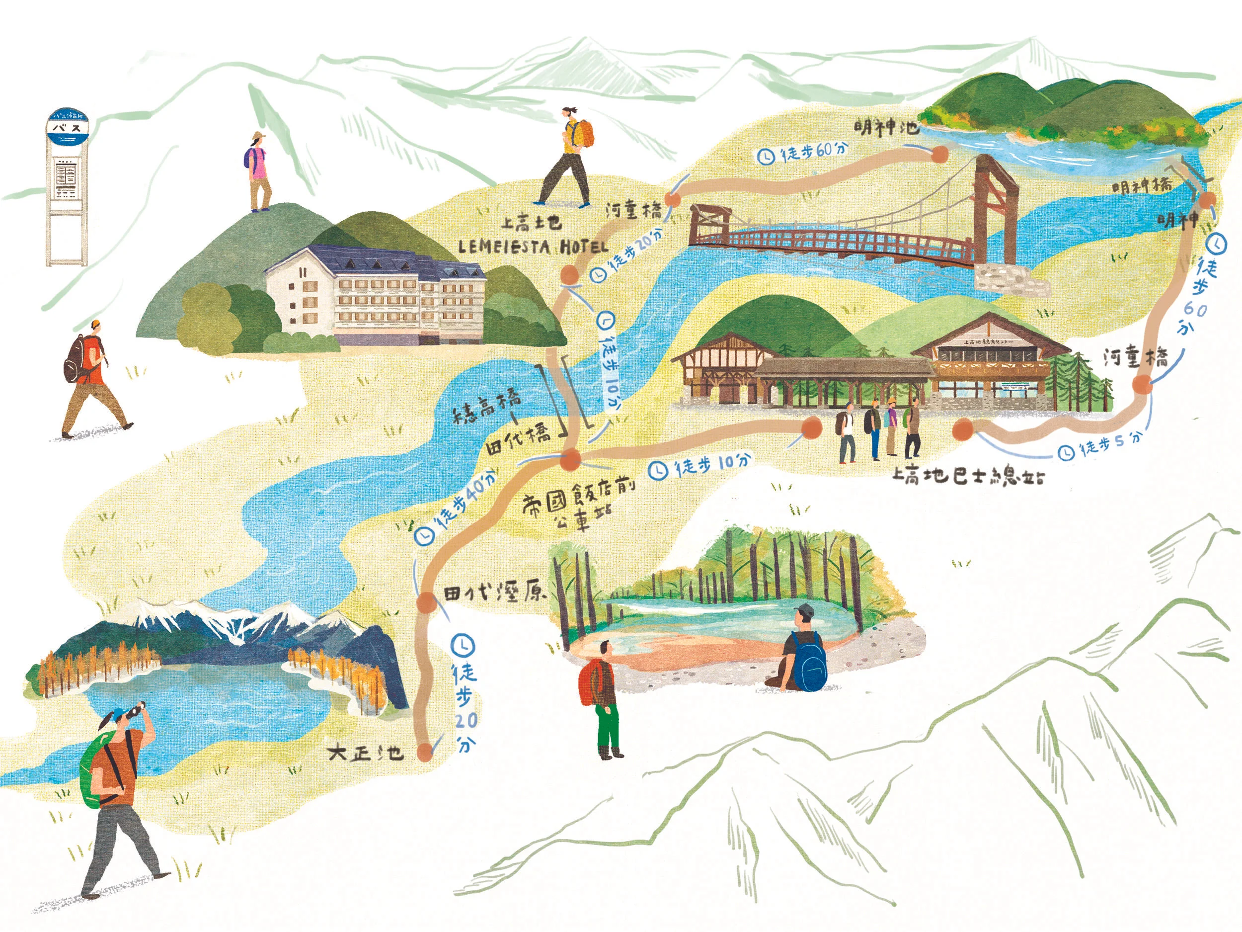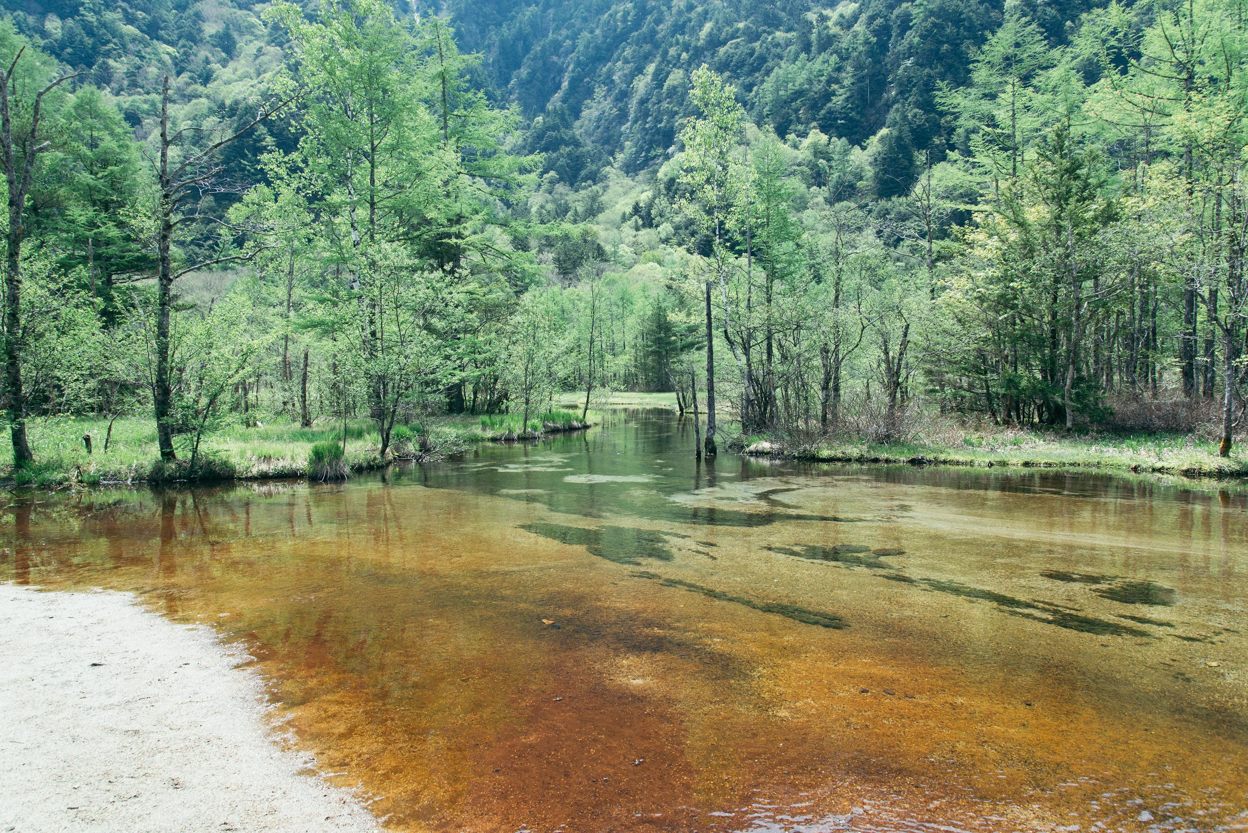 以大正池為起點的「上高地自然研究路」,彷彿是一段被樹林遮蔽、即使夏季也涼爽的冒險之路。漫步於小橋流水旁,聽著樹鶯輕盈的歌唱,如同吟詩般的愜意。過往雨水降入山峰,順著土壤的脈絡,一路延伸至地底、累積為池潭。池底的水草、枯木與泥沙自然地成為大地蛻變的養分,孕育出蘊藏有機生態的田代濕原。等到冬季來臨,青翠的樹林被純淨的雪花覆蓋,與冬陽輝映出神聖寂寥的冷白光芒。