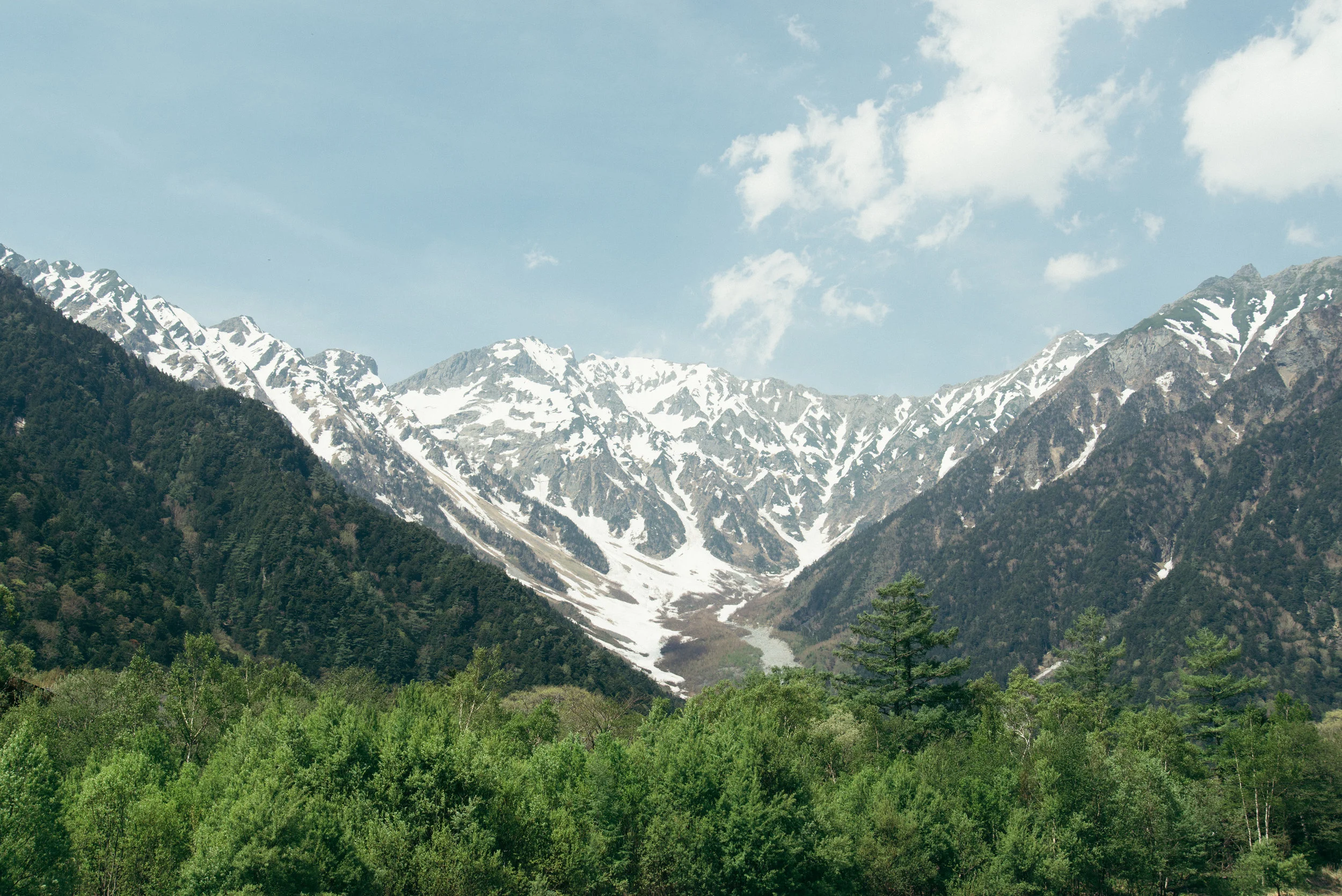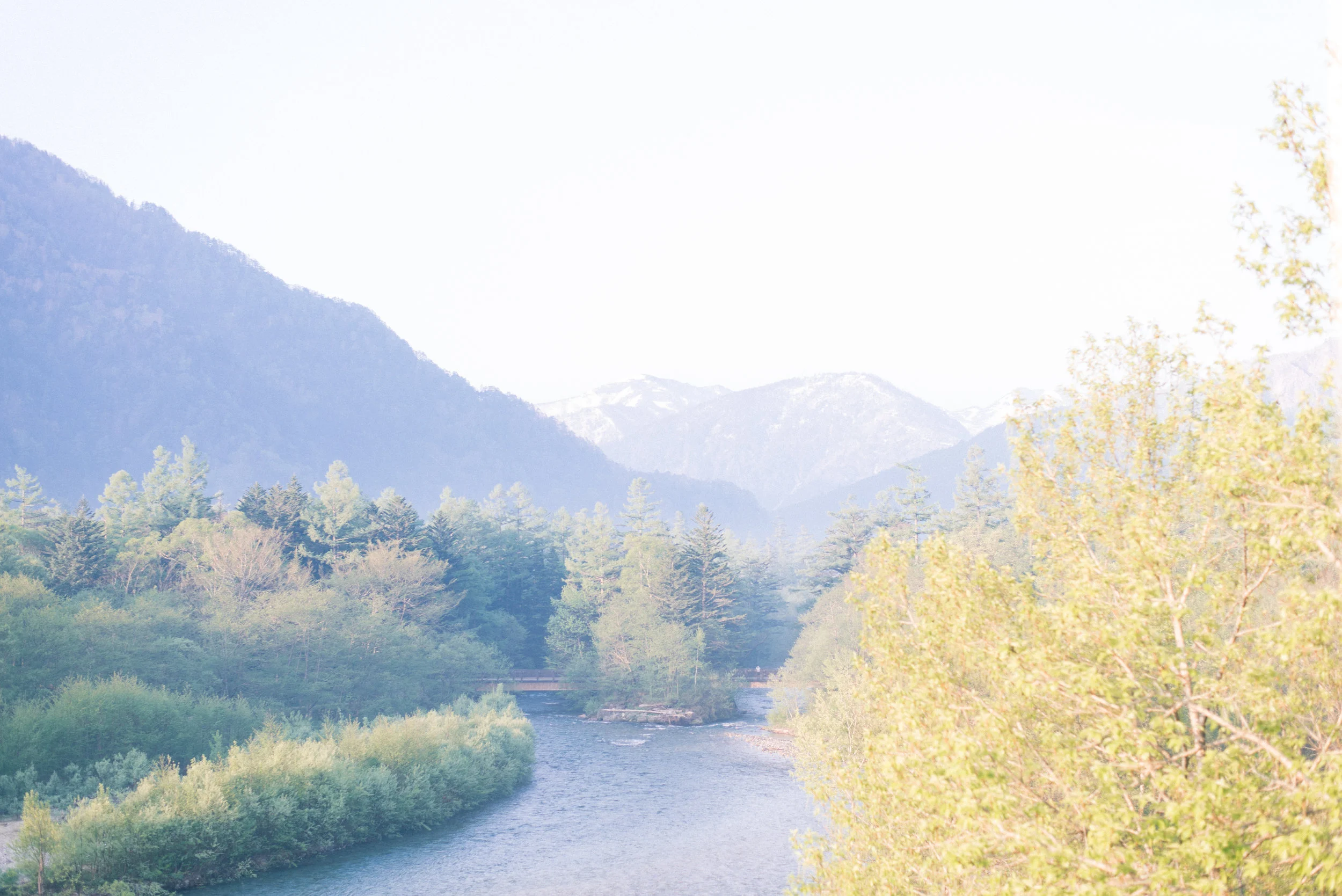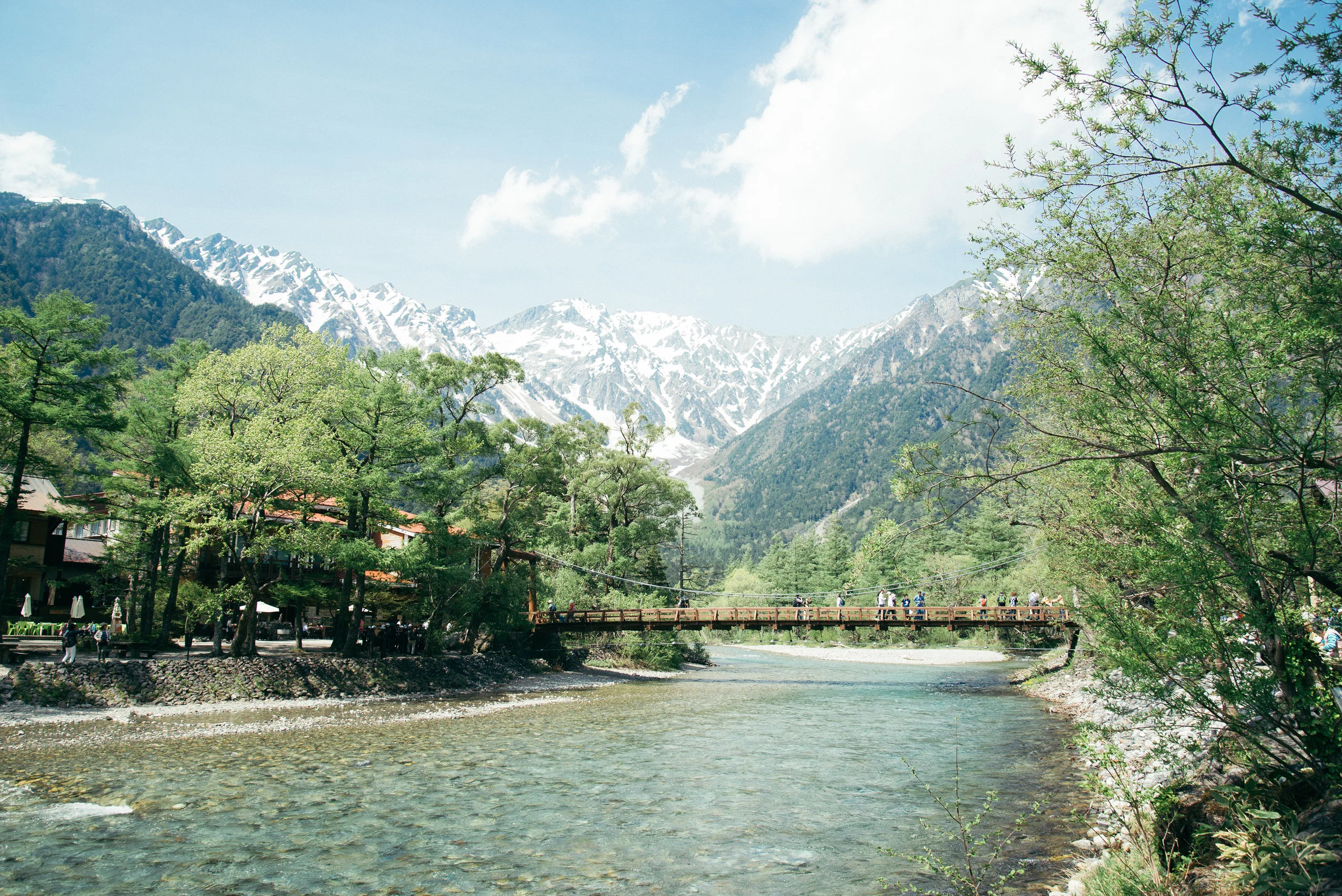湛藍的天空、蔥綠的樹林、純白的殘雪,以及閃著土耳其藍的溪流。度過了春分,尚未抵達夏日之際,擁有四個大地色系的上高地,是在地人們一致認為最美的時節。佇立在河童橋上欣賞這片壯麗,似乎也已成為上高地的象徵畫面。
