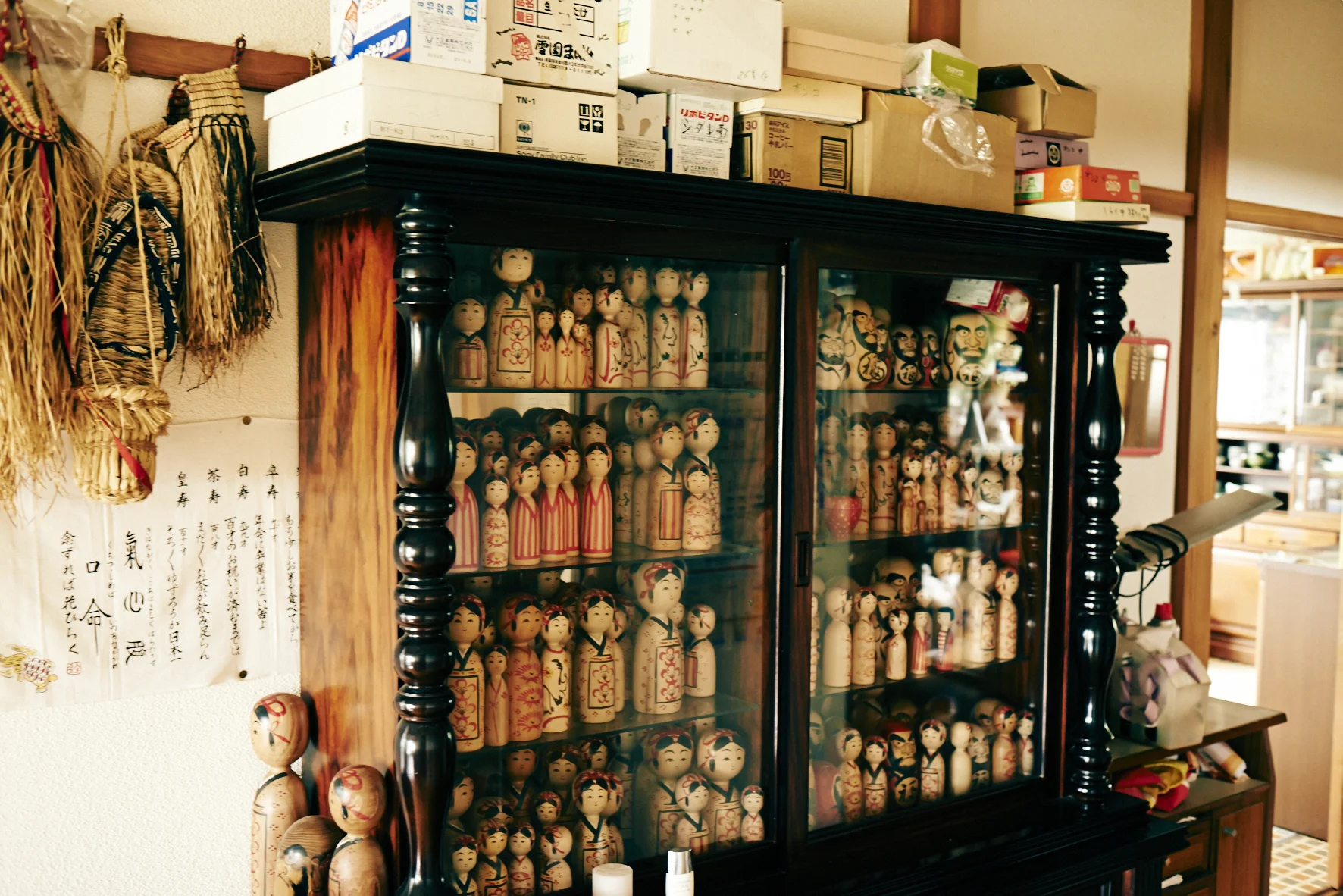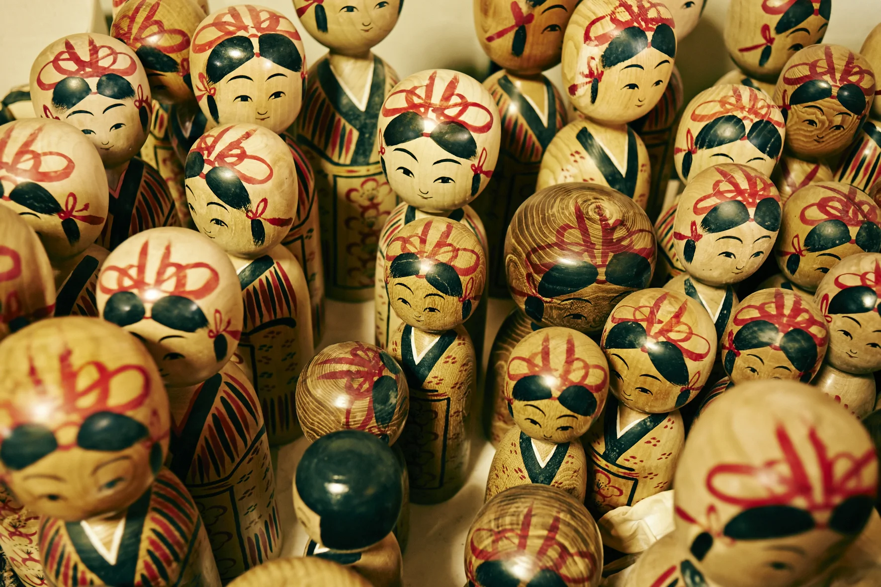 與稻庭烏龍麵為了在冬天保留美食的出發點有異曲同工之妙,盛產於東北的人形木偶「こけし」(Kokeshi,中文稱為「木芥子」),也是因應天寒地凍的雪季,人們可在屋內完成的手工民藝品。以木頭雕刻,有著簡單的肢幹及刻意放大的頭部,配上幾條用來表示臉部的線。身體部分有些紅、黑色(有時黃色、綠色) 的花樣,上頭覆蓋有一層蠟,沒有手腳,看起來像襁褓中的嬰兒般可愛。隨著地域不同而形成獨具特色的在地工藝,全日本共有10大流派,坐落在秋田縣湯澤市木地山旁的小南三郎工房,則是道地的「木地山系」,頭部有相當大的前髮,繪有紅色放射線的裝飾。著名於其向前垂下的身體。也有僅繪有菊花的古早樣式,淺淺的笑容與平整的短髮造型,看著看著不由得跟著「こけし」一同笑了起來。即便已成大師的小南三郎,至今仍雕刻著滿山的「こけし」,圍繞在他家中,超過百餘個的「こけし」,許多只是自己收藏(甚至是「練習」),不販售的他笑說,「這裡每一個こけし都是我親手誕生的孩子。」