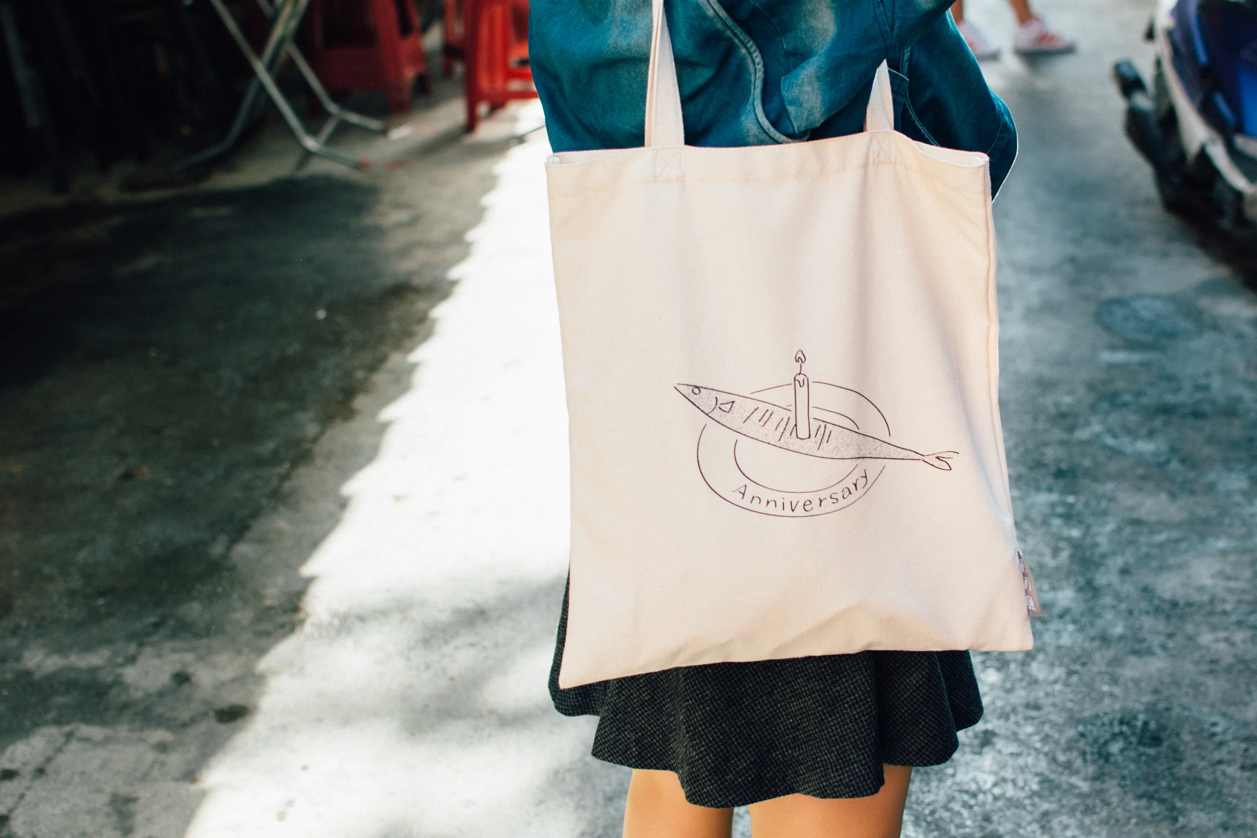 日本藝術家諸橋拓實特別為《秋刀魚》一週年繪製插著蠟燭的秋刀魚,推出「開動吧!秋刀魚提袋」,可輕鬆塞入一本最新出刊的《秋刀魚》,隨時滿足你心中想一秒到日本的心情。適合肩背或手提,防潑水、防皺及防縮處理的素色胚布袋,兼具耐用與耐看!