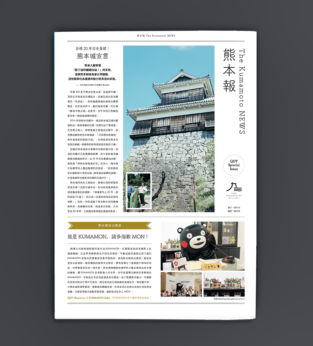 2016年4月16日,一場驚天動地的地震,打斷了熊本方圓百里的北九州生活步調,一夕間雖坍塌無數的屋瓦城牆,絲毫擊不垮九州人剛毅的性格。當地人說,「九州的好,在於平凡樸實,什麼都沒有卻也什麼都滿足之心。」近半年的時光重建家園,日子還是要過,九州人臉上沒有過多的倦容,反倒以樂觀爆表的心情,直挺挺的繼續迎接隔日的陽光。《秋刀魚》本次特別推出《熊本報》(The Kumamoto NEWS),帶領讀者們來場深入淺出的熊本之旅!跟著在地人嚐一碗醇厚的熊本拉麵;走訪豐潤街道的山鹿溫泉、八千代座;來到熊本最強公務員「KUMAMON」辦公室,認識這位幽默的幸福部部長;更多充滿笑顏、溫柔且堅毅的熊本人故事就在《熊本報》,讓我們一起為熊本加油打氣!