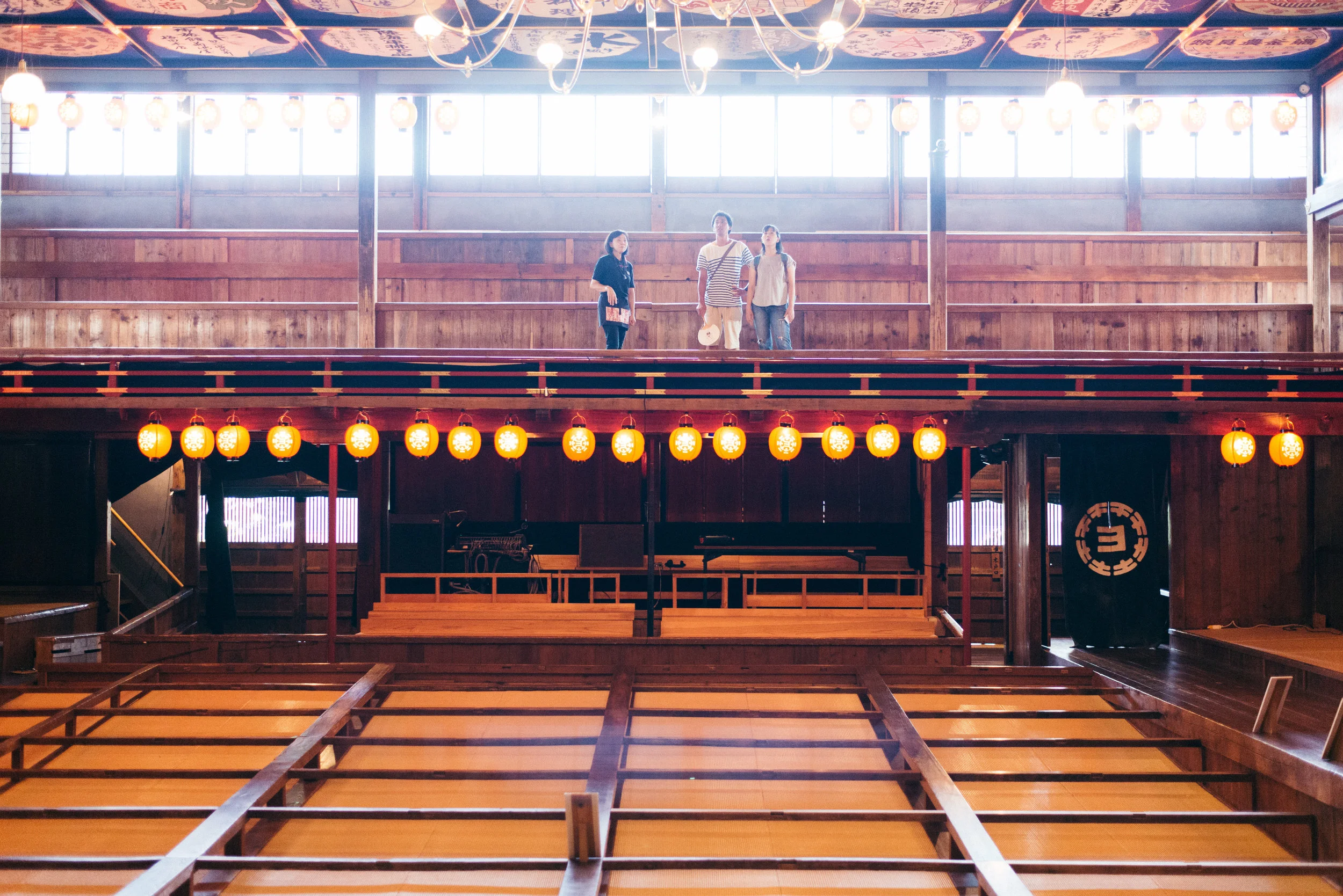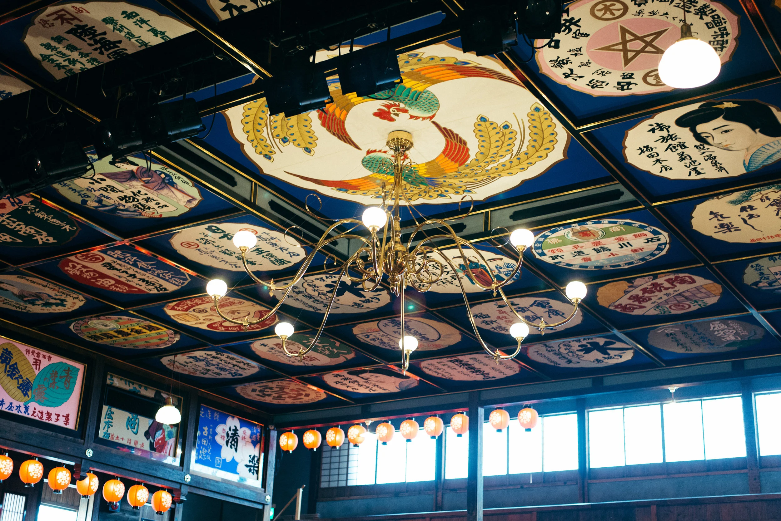 一踏入八千代座,不禁為寬廣的空間而發出讚嘆,迎面而來的舞臺向兩側延伸出兩層樓的座席,座席上方掛著燈籠的紅暈,彷彿搖曳著百年來的風華。挑高的天花板上並排著色彩豔麗的繪畫,管理者石橋和幸說,這些全都是重新繪製百年前山鹿當地店家的廣告看板,如今雖然只剩下七家商店,卻好像能藉由鮮豔的色彩將人拉回到過去山鹿街道的盛況,並懾服於明治時期以來的日本美學品味。