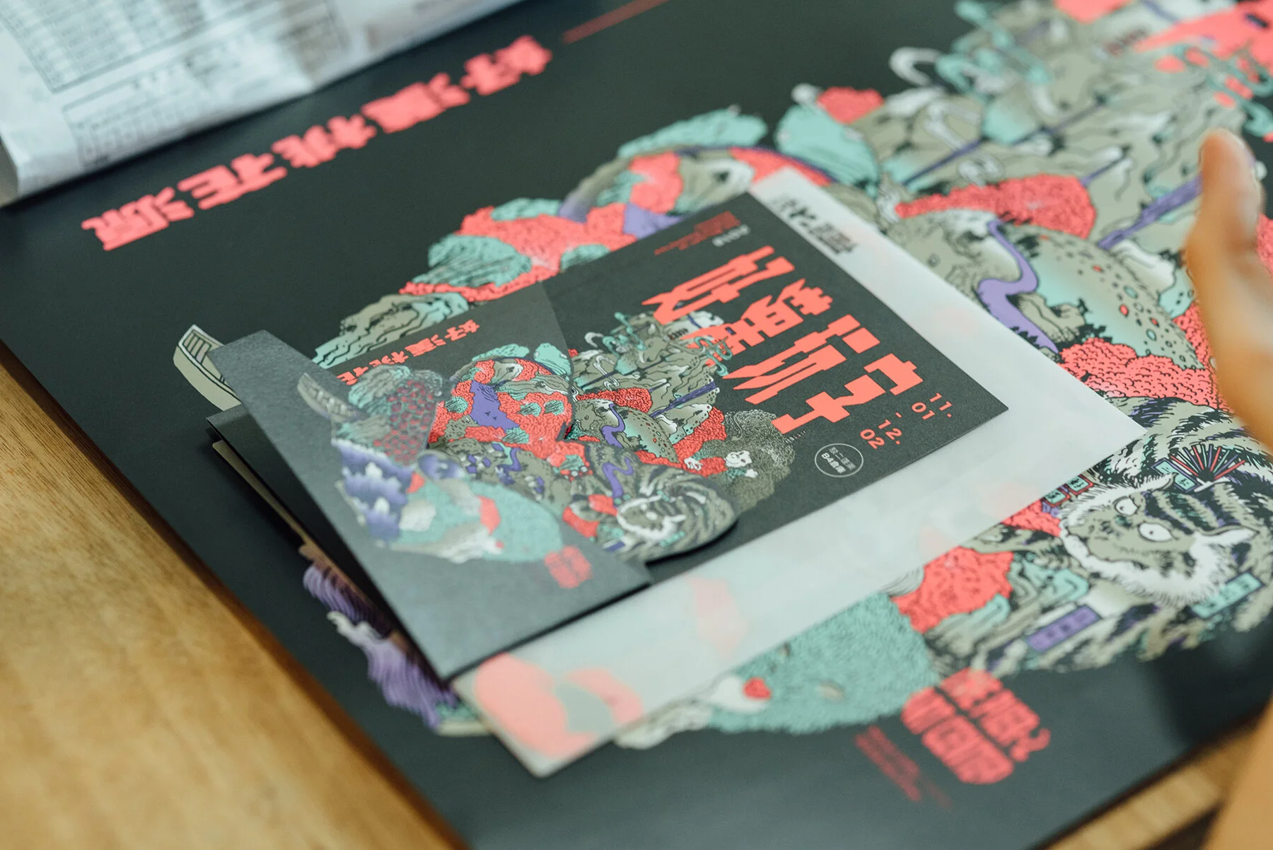 「好漢玩字節」中以特殊色運用於邀請卡、海報、票券等製作物,透過印刷技巧強化視覺整體性。