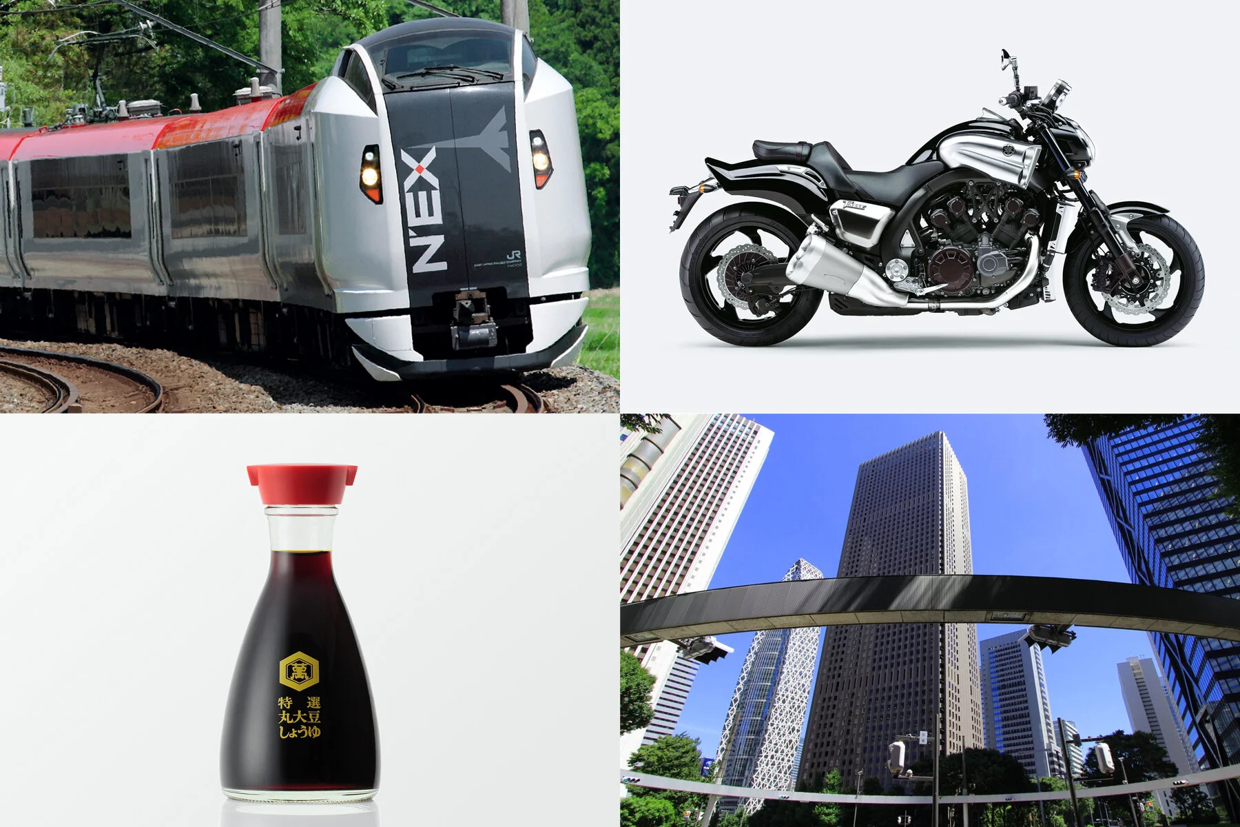GK設計集團的作品融入大眾日常生活(左起:成田N‘EX特快列車、龜甲萬醬油瓶、三葉機車、西新宿交通標誌。 (圖片擷取自GK Design Group官網)