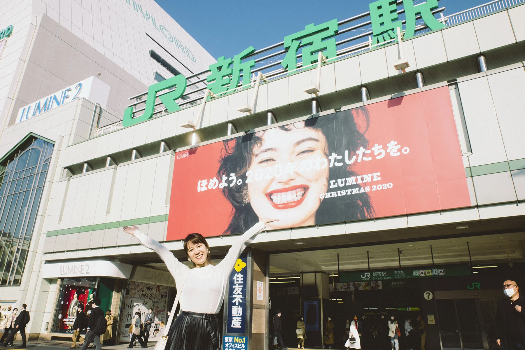 LUMINE新宿店1館及2館與JR山手線新宿站站體相連,附近還有LUMINE EST。新宿站南口上的招牌,是形象大使諧星ゆりやん拍攝的冬季視覺。(攝影/関竜太)