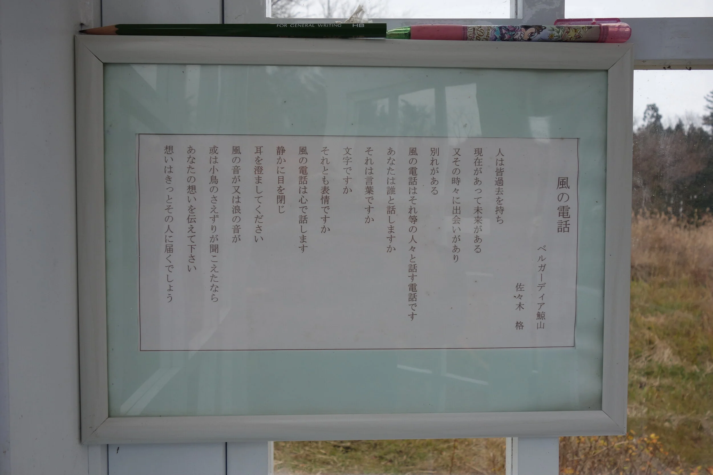 其實在2009年就開始考慮在花園的一隅設置電話亭,當時才大我4歲的堂(表)兄被檢查出罹患癌症,只剩3個月的壽命。我開始理解到人類的生命其實是相是當脆弱的,比起「存在」(生)的時間,人說不定「不在」(死)的時間更長。如果這樣想的話,或許死後的牽絆更為重要。這也是我打造「風的電話」的契機,不論是否有語言文字,拿起話筒的瞬間就傳遞了想念的心意,開啟了這無法實際連線,卻可串連思念的電話亭。