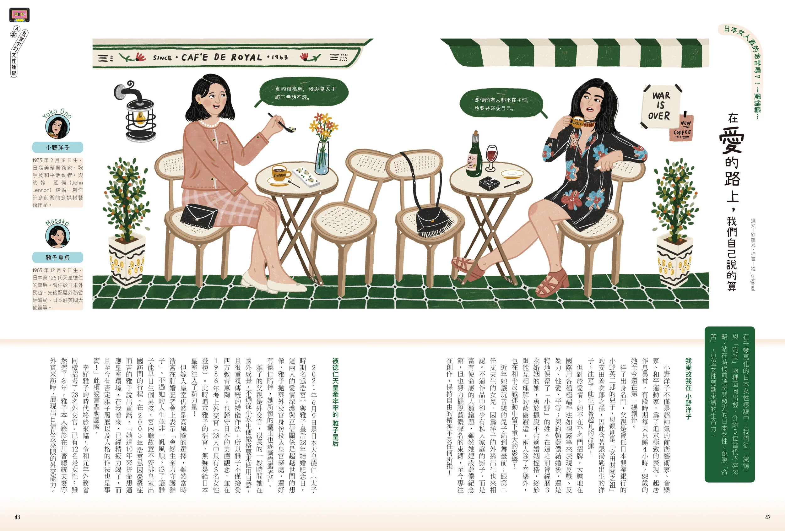 因此,本期希望記錄日本女性正在發聲的關鍵時刻,無論是撕下審美觀的非典型創作女團 CHAI;從東大學霸光環轉而為自己學習、開創服飾品牌 sneeuw 的主理人雪浦聖子;用裸體攝影找到純粹家族關係的攝影家長島有里枝,或是年僅26歲的 High(er) Magazine 編輯長Haru.,以不登記的「事實婚」,與伴侶走向更自由的夫妻關係。就像日本女性可從《阿信》的刻苦耐勞中獲得釋放、也能因溝通與了解,在男女關係中找到《月薪嬌妻》的平衡。而我,也跟著《大豆田永久子與三個前夫》女主角找尋母親與昔日好友的「女女」情感中,突然想通那不婚的乾媽,或許只是比我們更坦率地面對自己的情感。