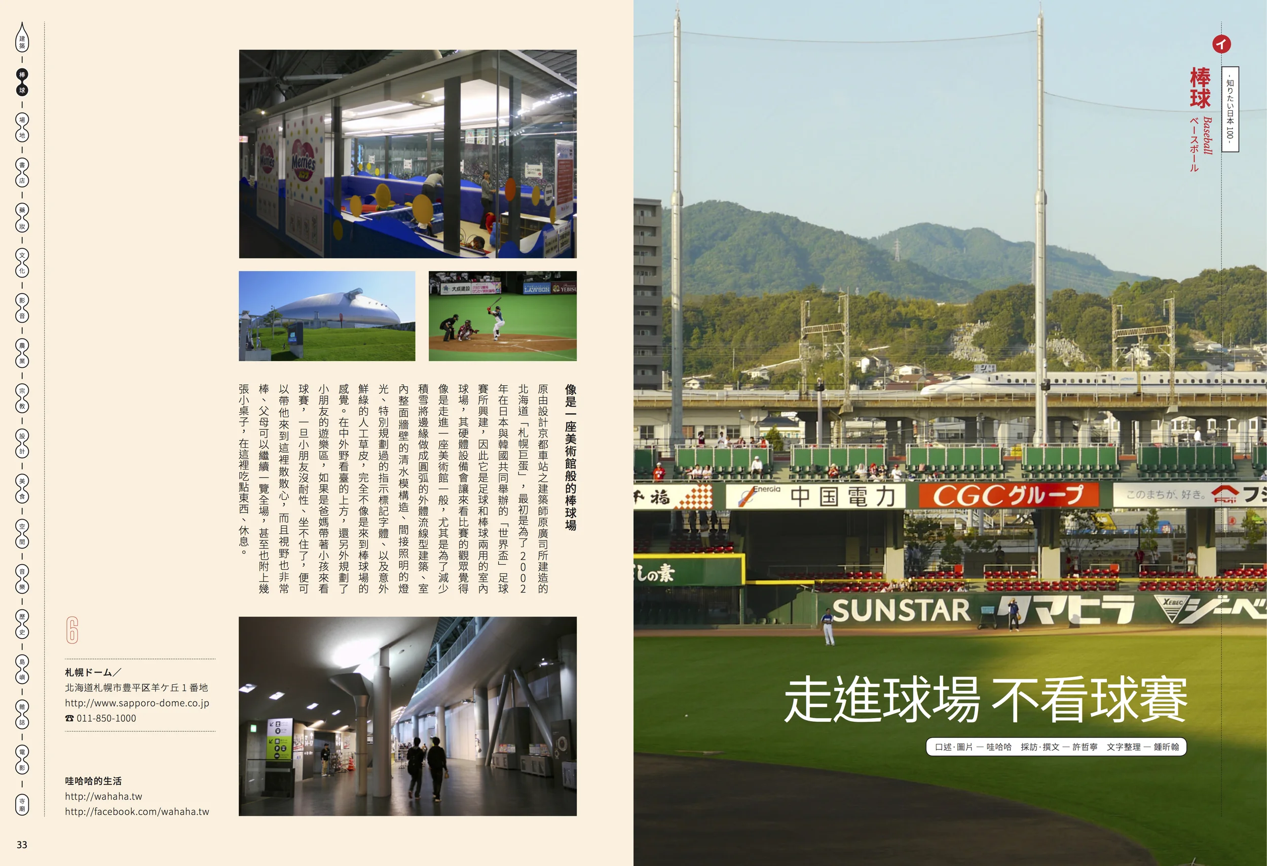 或許您曾經看過他的部落格或是 Facebook,名為「哇哈哈」的部落客是一位熱愛鐵道和棒球文化的作者,撰寫過《日本職棒球場散步》和《東京電車散步》兩本書,這一次《秋刀魚》創刊號特輯「好想認識的100種日本」裡頭,我們請哇哈哈推薦3座日本職業棒球團主場,有2002年為了世界盃而建造、由設計京都車站的建築師原廣司規劃之「札幌巨蛋」、在「千葉海洋體育場」感受日本最強棒球應援團、以及千變萬化每次去都有著不同座席的「廣島市民球場」,在棒球賽之餘,還能看見軟、硬體的文化力,即使不是熱愛棒球的朋友,也會默默被吸引的啊。