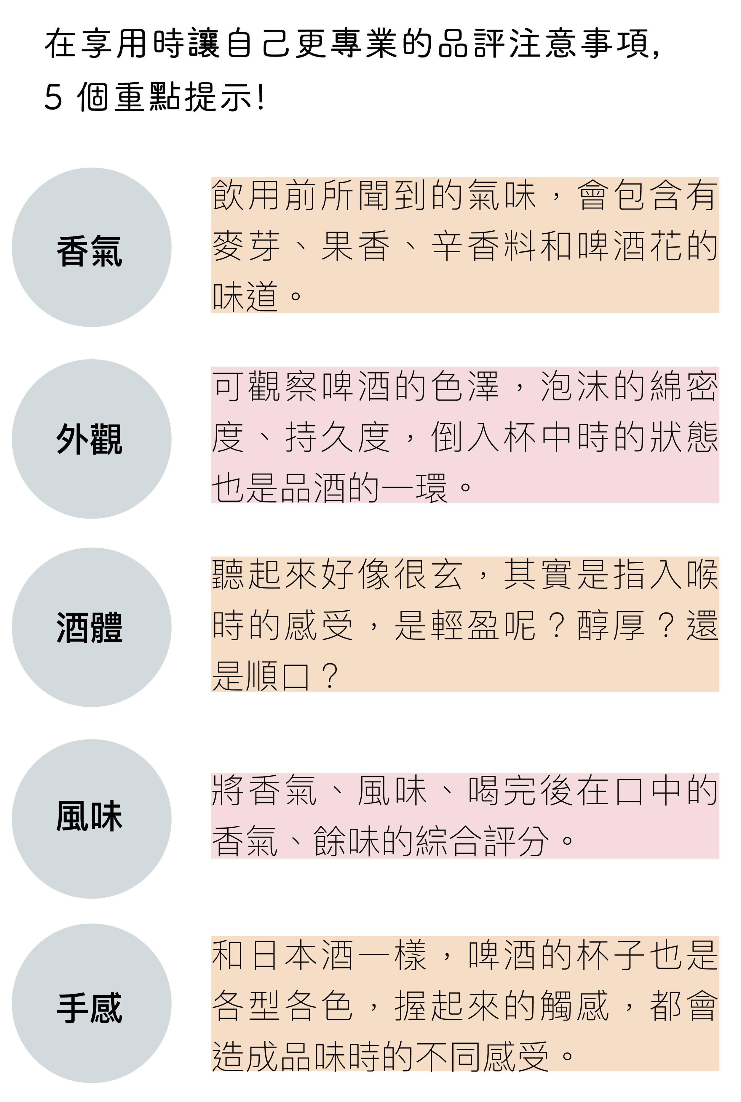 Tip:啤酒的評斷有一些實際的參考數值喔!例如苦味的國際單位 IBU、酒精濃度為 ABV、啤酒色度 SRM。