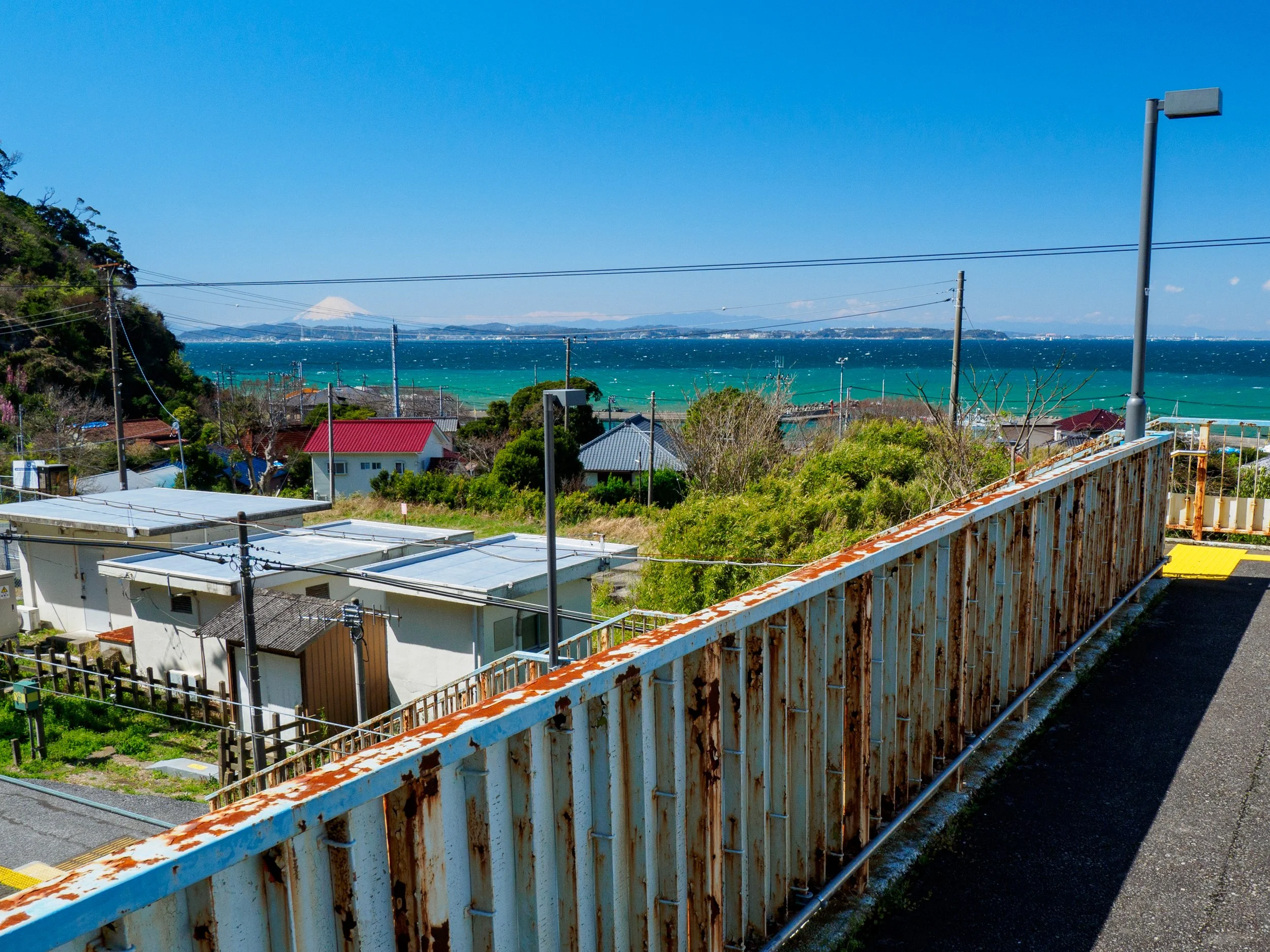 爬上空無一人的跨線橋,視野變得更加開闊。在晴朗的日子裡,可以看到遙遠的富士山,是少數可以同時看見海和富士山的車站。再望向東京灣裡大大小小、川流不息的船隻,令人目不暇給。雖然每小時左右才有一列火車,但豐富的體驗讓人感覺不到時間的長。