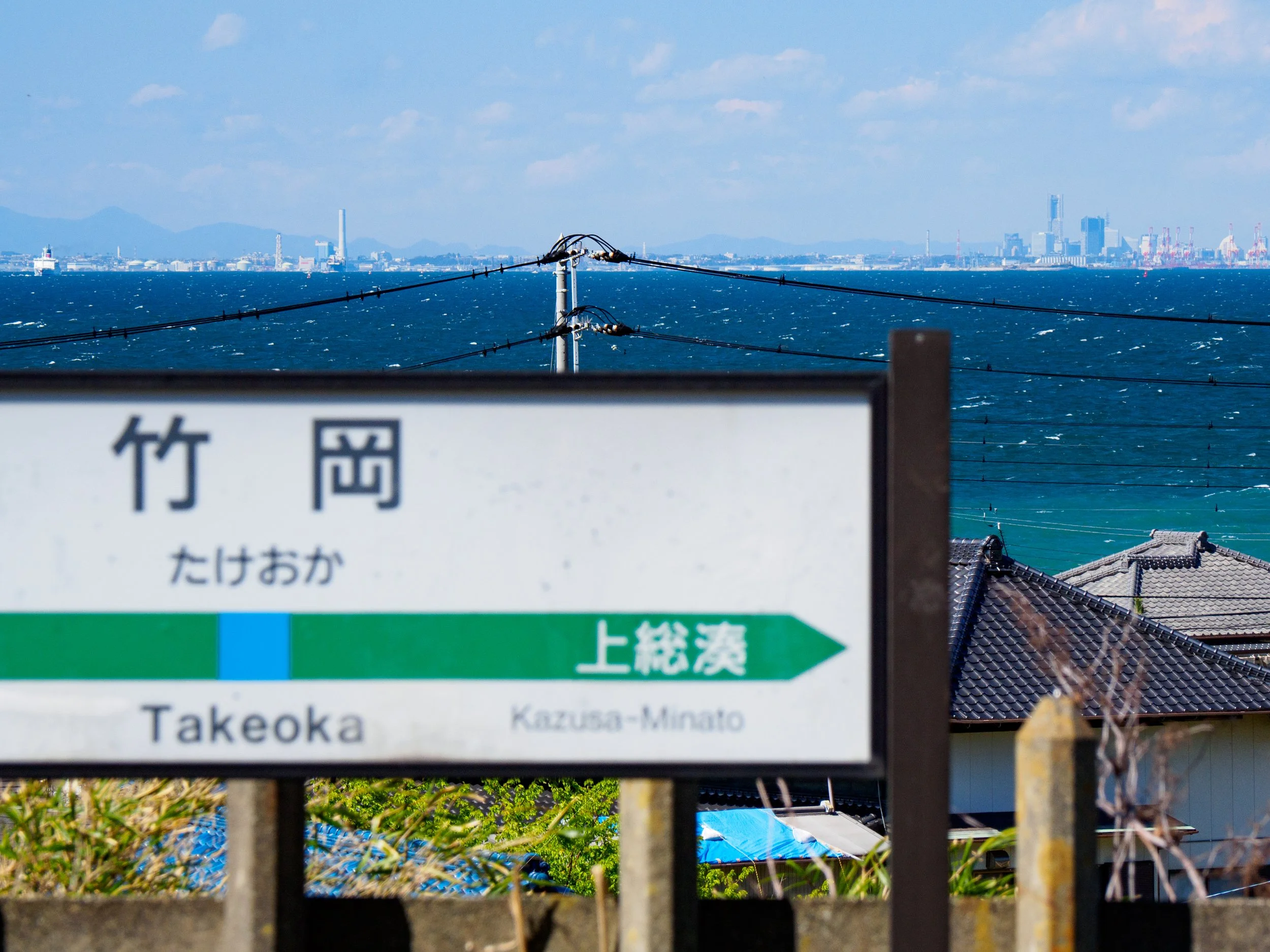 千葉縣的房總半島將東京灣與太平洋分開,JR內房線和外房線環繞成半島的輪廓,人們從火車窗外可以盡情地享受海景。在這條線上有許多車站可以看到大海,其中內房線上的竹岡駅擁有最好的景觀。當你從位於高地的竹岡駅月台往下走時,你會立刻被東京灣的美景所震撼,車站前的山坡上幾間房屋錯落在田地間,仰望天空,還可以看到海鷗飛翔之姿,由於竹岡駅是無人車站所以乘客很少,與海另一邊的橫濱建築物相比,這裡則延展著閑靜的風景。