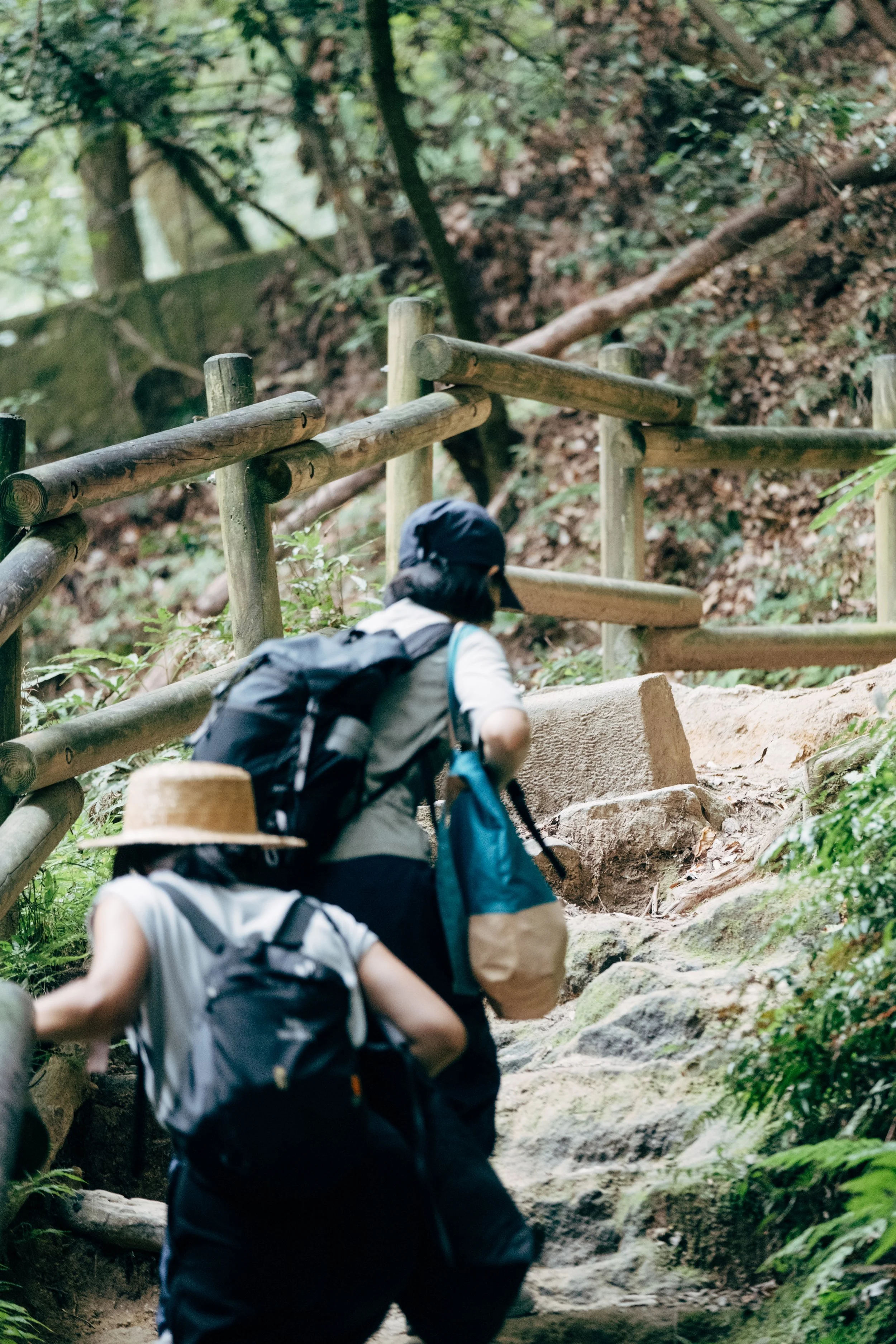 大文字山的海拔爬升由緩至急,起步不久的碎石緩坡旁有小河潺潺,領著登山的人走入綠意,聳至天邊的樹也開始有了與平地相異的長相。穿過小河後,抵達大文字山的登山口,沿著步道拾級而上,爬著爬著也有所發現,常常轉個彎,步道就長成完全不同的樣式。比起許多人工水泥鋪整的痕跡,前半段多是順應自然肌理的手作步道,有時幾顆大石頭就堆疊成路,樹根緊緊抓住土地,也織成了能往上行走的徑,是人為還是自然所為有時很難分辨,看似不甚精緻的路,其實也有它的精緻,就像幫山路搭配合適的衣服般得宜,走起來能感受每種路況帶來的興味。
