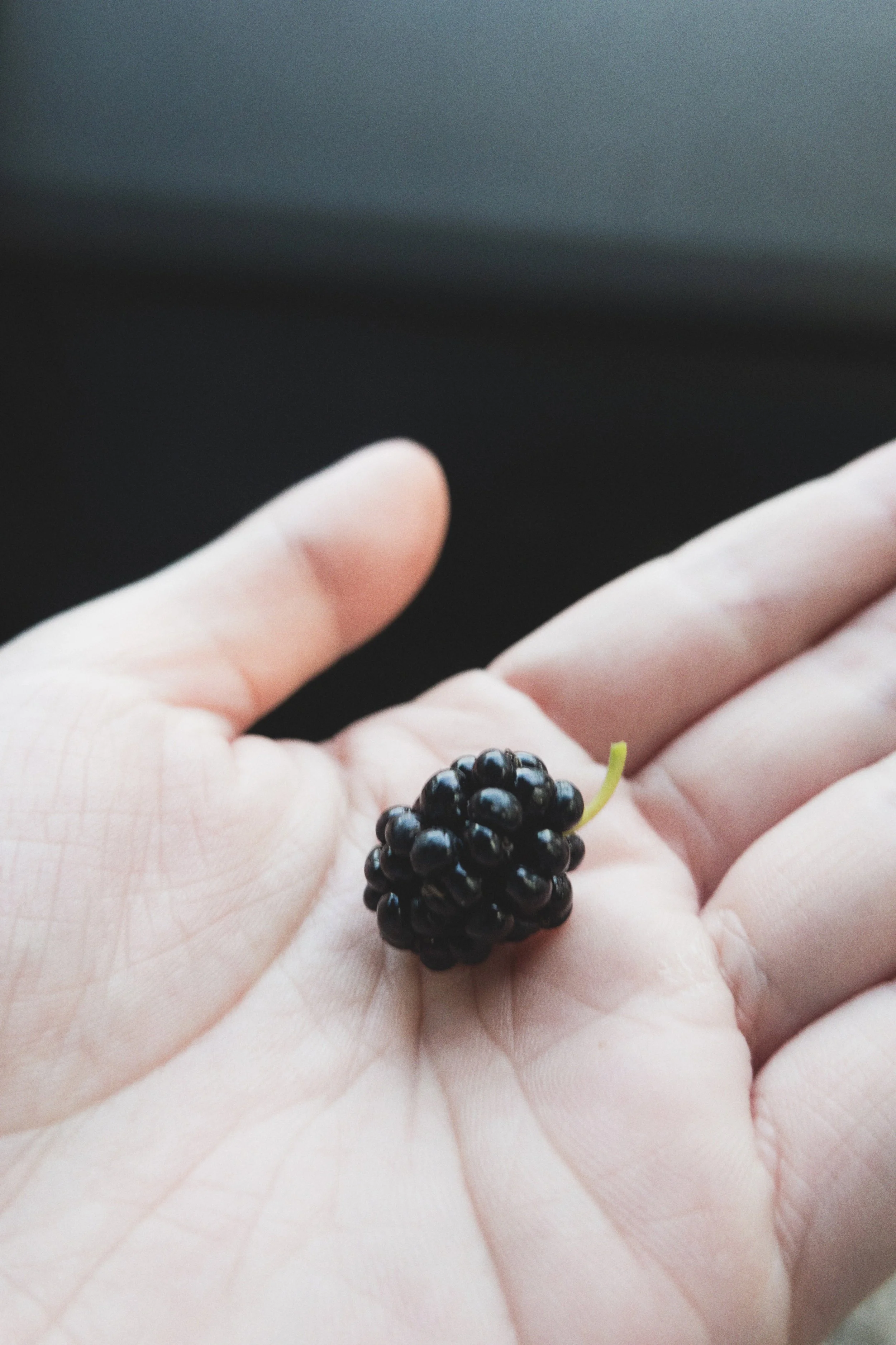 停車場生病的桑椹樹隔壁有一棵結了果!我偷偷摘了一顆但怕壓扁,一路放在手掌上