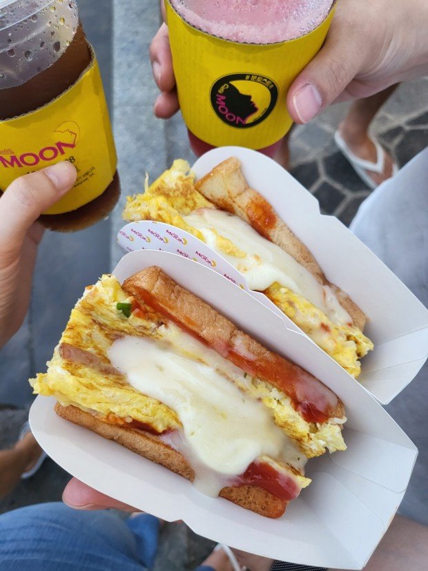 將火腿、雞蛋、蔬菜配上特製醬料夾入烤吐司中。「衝浪後要吃吐司」最近在衝浪者聖地松亭海灘流行。