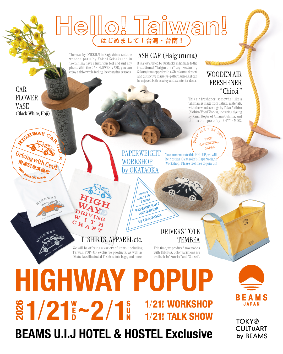 HIGHWAY以「Driving With Craft」為理念,宗旨在重新詮釋汽車配件,他們找來了鹿兒島在地的工藝單位合作,透過木工、陶藝、染色等媒材創造新的「Car Craft」。他們也和藝術家合作推出服裝和周邊,自由地駛出各種可能性。這兩年品牌進一步提升活動的規模,在日本各地的BEAMS展開pop-up活動,展售廣獲好評的商品,如:與「ONE KILN・一窯」合作的車用花瓶、與「秋廣木工」合作的擴香木飾、與「TEMBEA」合作的車用收納袋等,全是超實用單品!今年(2026)1月下旬,オカタオカ本人就要帶著「HIGHWAY」於臺南BEAMS U.I.J HOTEL & HOSTEL登場!一起來關注吧!